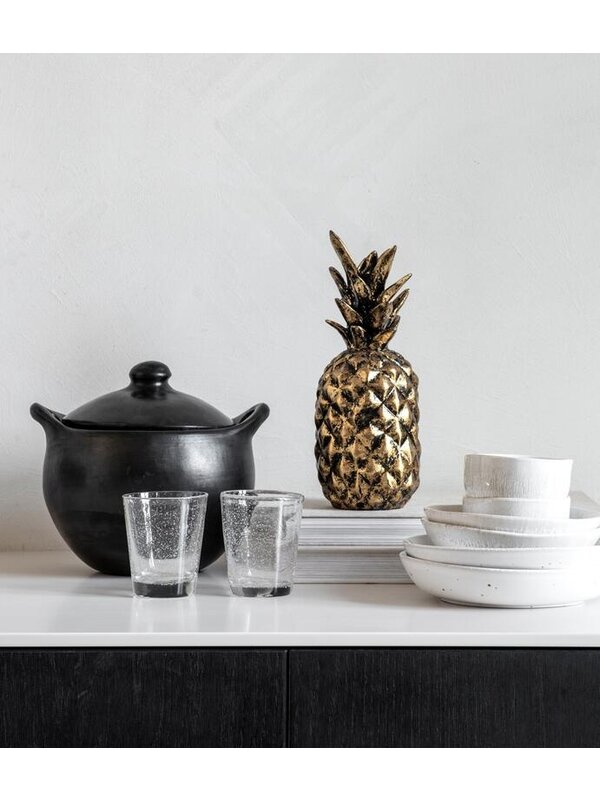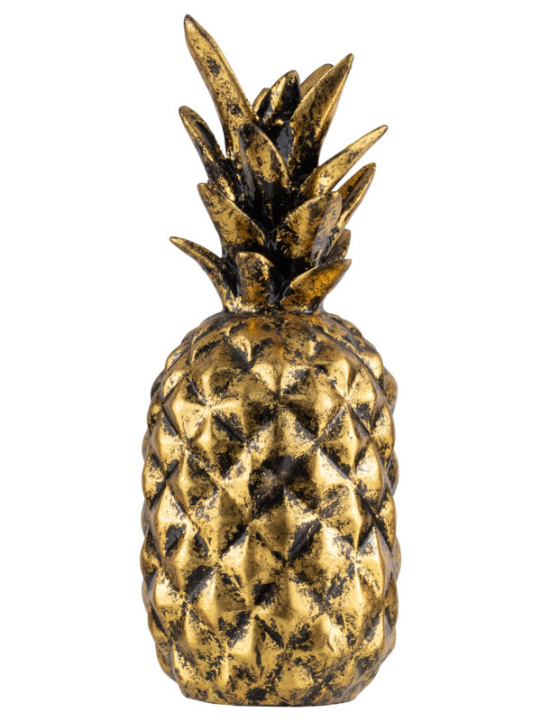 In een sfeervol interieur vol zwarte details, velvet en marmer voegen ze ambiance, luxe en een speelse touch toe. Maar ook in andere interieurstijlen vind je er vast een mooi plekje voor. De beelden zijn gemaakt van polystone, een zwaar kunststeen van goede kwaliteit. De Ananas in goud heeft een afmeting van 30xØ12 cm en is verkrijgbaar in verschillende kleuren.