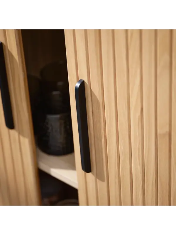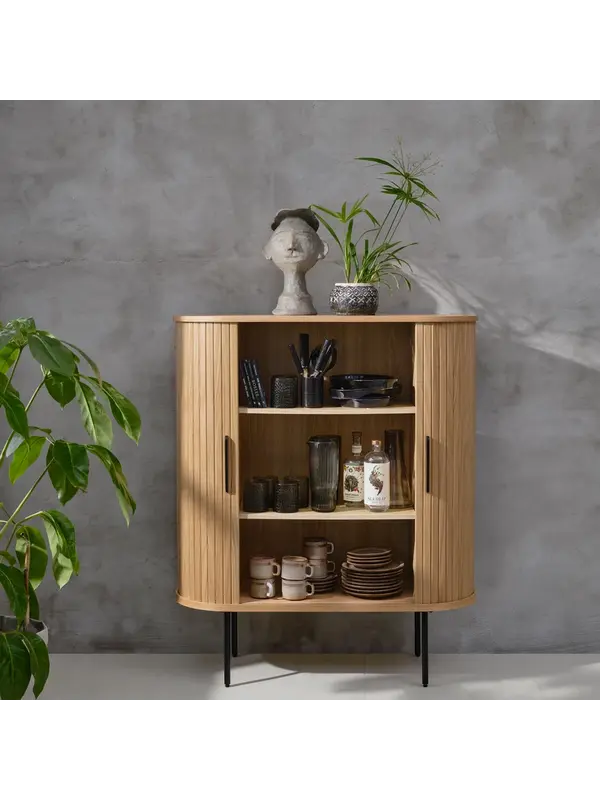 Bergkast Barber is de ideale kast om je spullen in op te bergen. De kast wordt gekenmerkt door zijn ronde hoeken, het lijnenspel en de hoge pootjes die hem tot een stijlvolle en speelse kast maken. Achter de twee schuifdeuren bevinden zich drie planken.De kast is gemaakt van eiken fineer gecombineerd met een zwart stalen pootjes en is verkrijgbaar in naturel, wit, bruin en zwart. Barber is zelf eenvoudig te monteren en daardoor makkelijk voor transport.