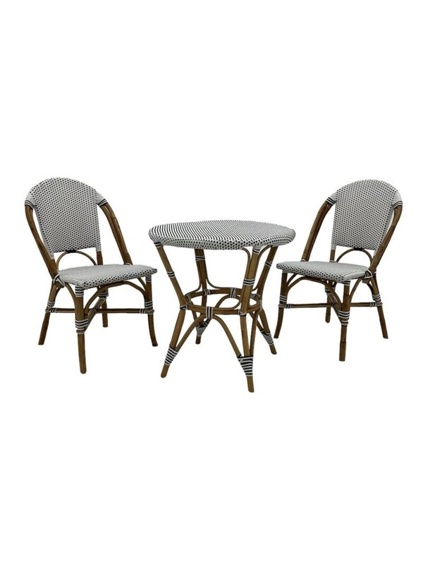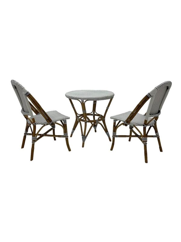 Haal Parijs nu ook naar jouw balkon of tuin! Deze typisch Franse bistro set is ideaal voor in de tuin of op je balkon en is makkelijk te verplaatsen door het kunststof materiaal. De tafel met stoelen kunnen namelijk het hele jaar door buiten blijven staan. De afmetingen van de tafel zijn 70xØ71 cm en van de twee stoelen zijn 92x45x58 cm.