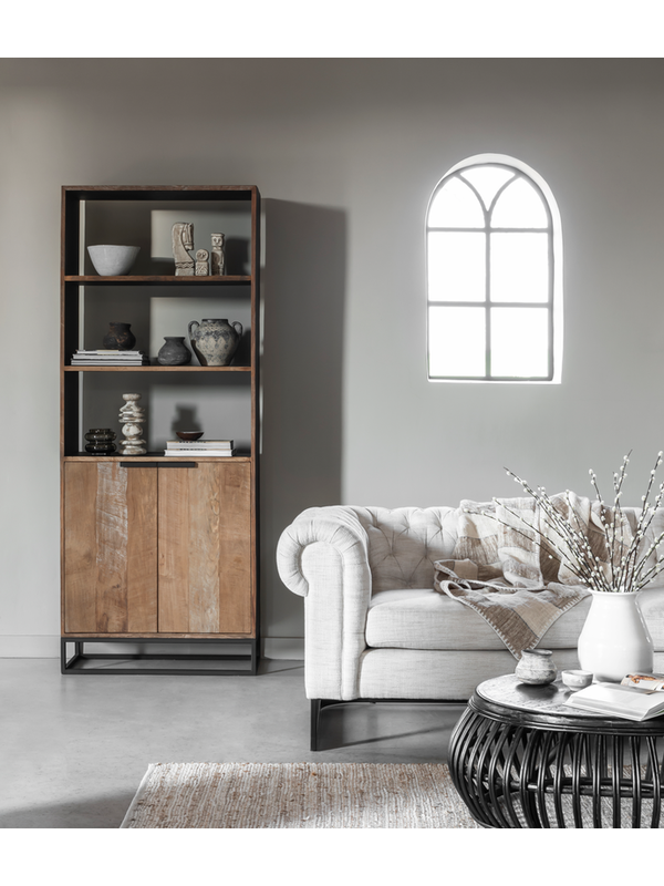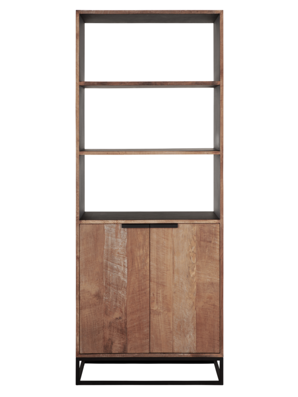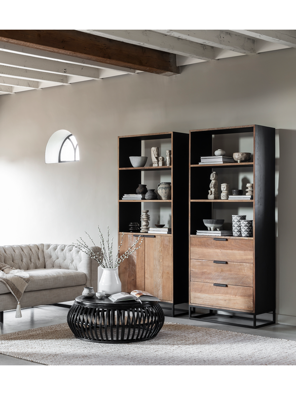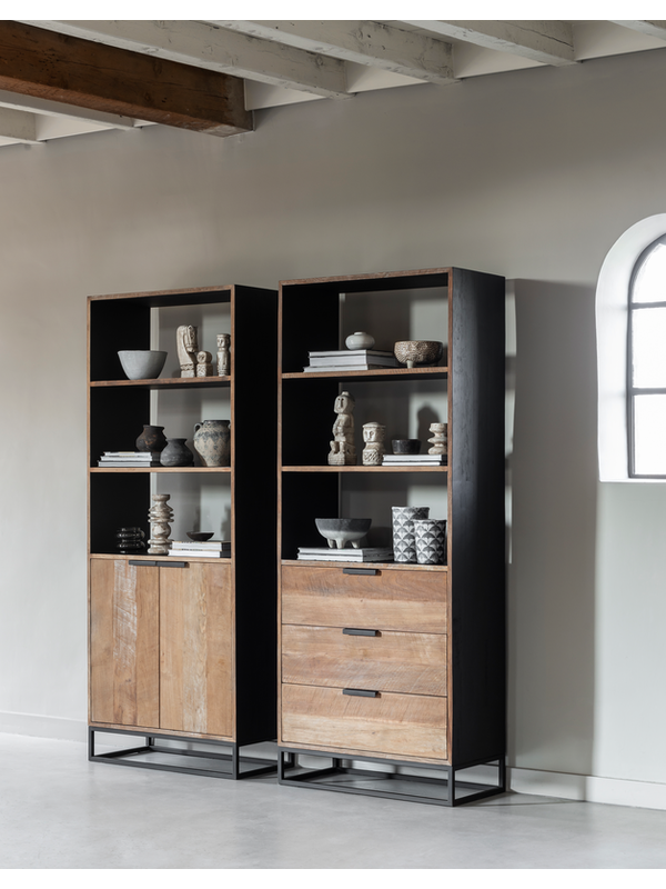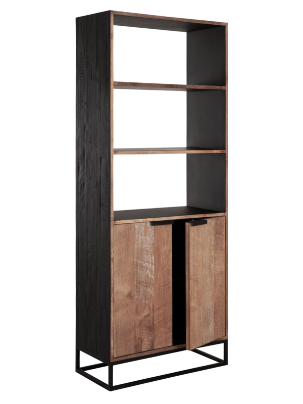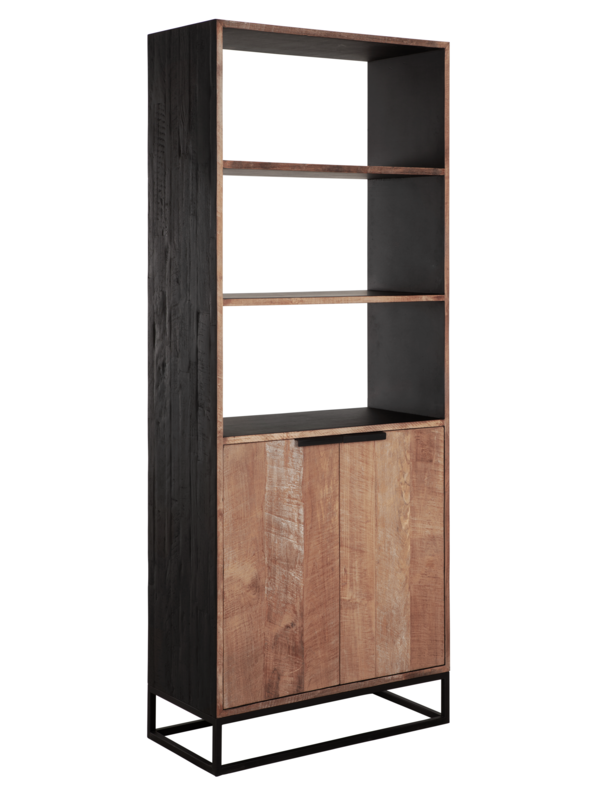 Boekenkast Coos is een bijzondere verschijning. Het meubel is gemaakt van gerecycled teakhout, waarbij de buitenzijde is afgewerkt met een zwarte beits en finish. De binnenkant en planken zijn afgewerkt met zwarte verf. Het meubel biedt genoeg opbergruimte achter de deuren, maar ook de planken zijn handig om boeken of manden met minder mooie spullen op neer te zetten. De boekenkast onderscheidt zich door de opvallende combinatie van naturel en zwart teakhout. Dit zorgt voor spannende contrasten tussen het hout, de metalen greepjes en het strakke onderstel.