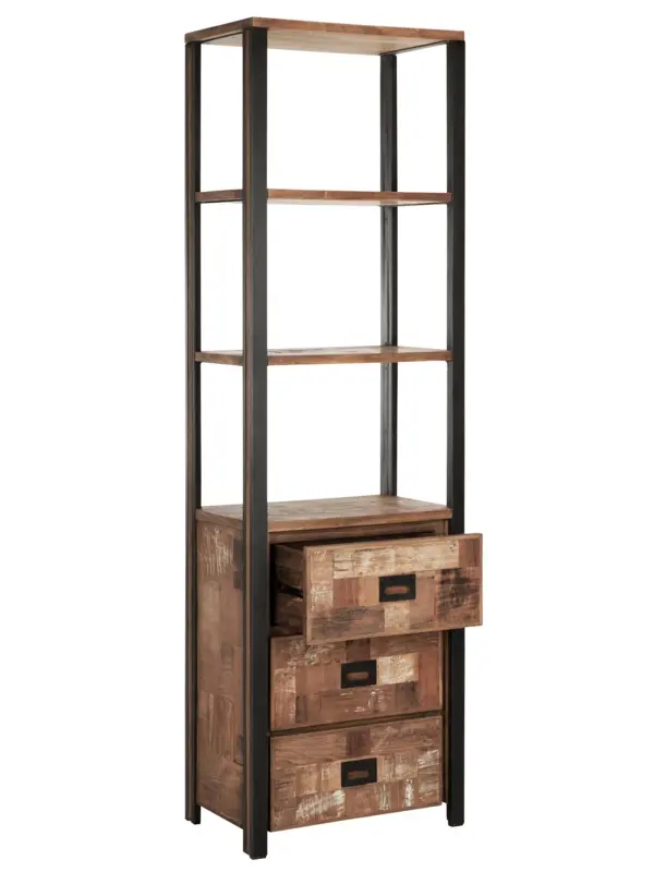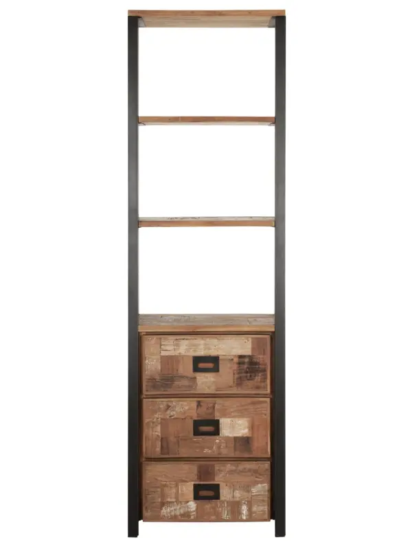 Boekenkast Kuta oogt industrieel en strak, maar tegelijkertijd ook karakteristiek en werelds. Deze smalle boekenkast biedt voldoende ruimte voor je mooiste accessoires en favoriete boeken. Het meubel is gemaakt van gerecycled teakhout en afgewerkt met een