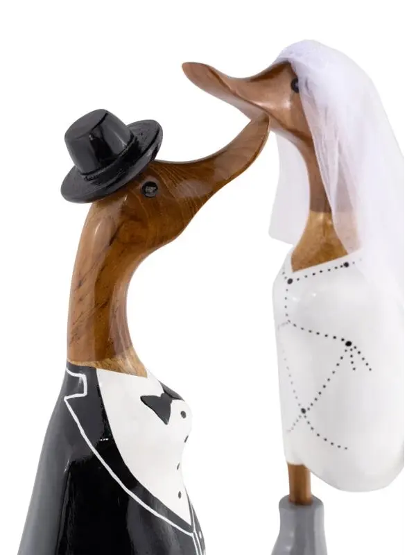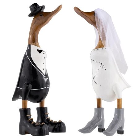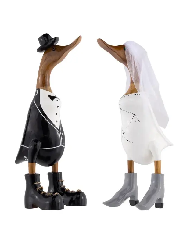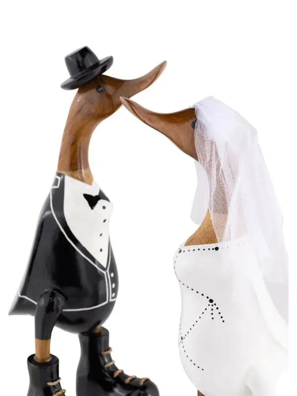 Daar komt de bruid! Dit prachtige eendenkoppel is het perfecte cadeau voor een pasgetrouwd stel. Niet zo saai en standaard, maar juist vrolijk en bijzonder. Onze Ducks komen in verschillende thema's. Zo heb je voor iedere feestdag, beroep of andere gelegenheid een unieke eend. Plaats ze samen in een vitrinekast van De Troubadour en creëer één grote Duck familie.
