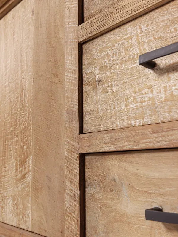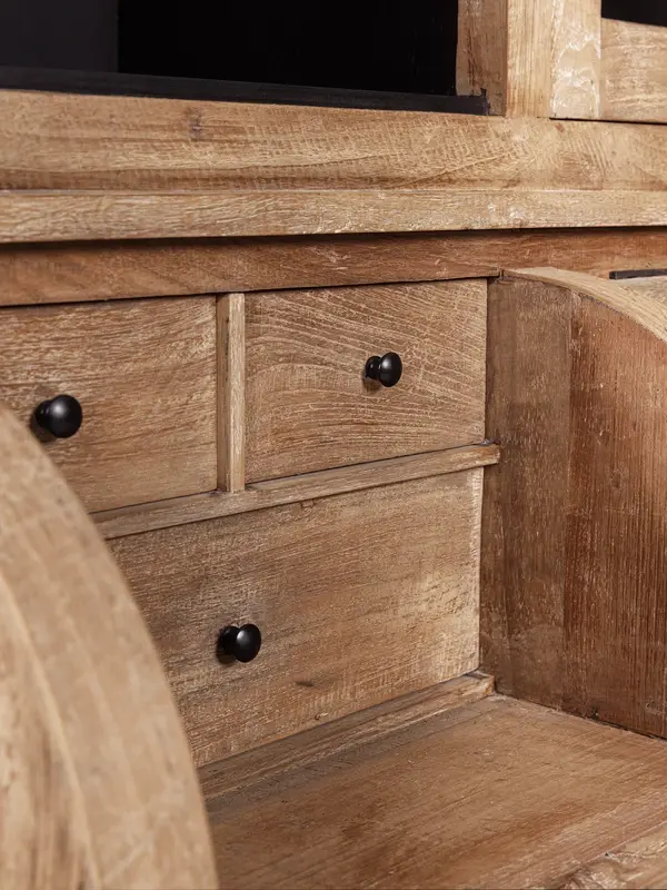 Oud en nieuw komen samen in deze ambachtelijk vervaardigde kast. Hij biedt mogelijkheden tot het tentoonstellen van je mooiste woonaccessoires en servies. Daarnaast is er ook genoeg opbergruimte achter de gesloten deuren. De buffetkast is gemaakt van gerecycled teakhout.