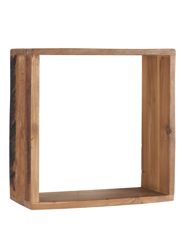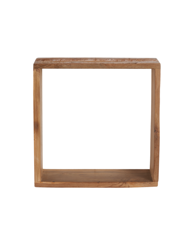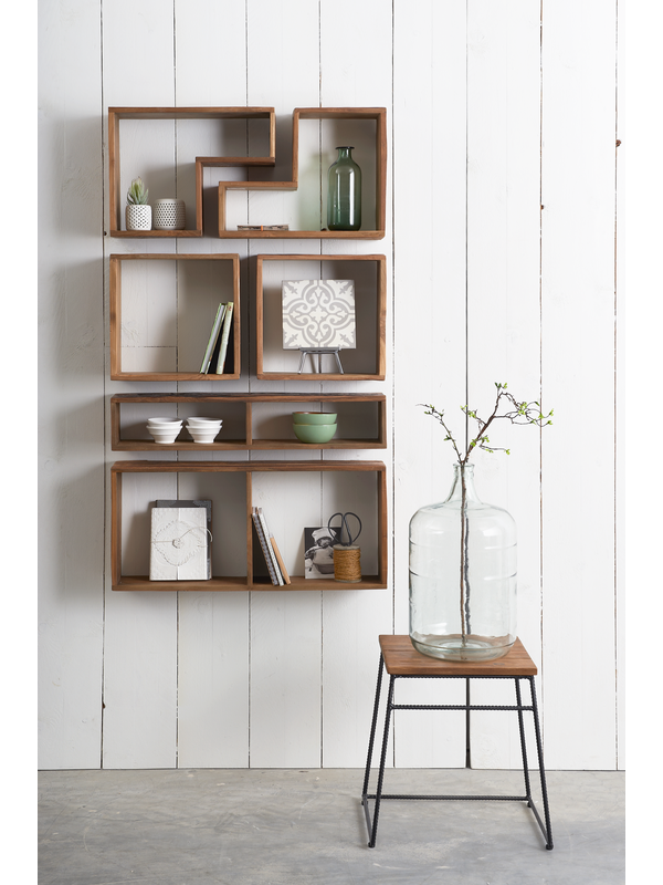 Dit wandrek is gemaakt van teakhout en is gemakkelijk aan de muur te bevestigen. Door verschillende wandrekken met elkaar te combineren creëer je je eigen unieke wanddecoratie. Het rek heeft een afmeting van 35x35x15 cm.