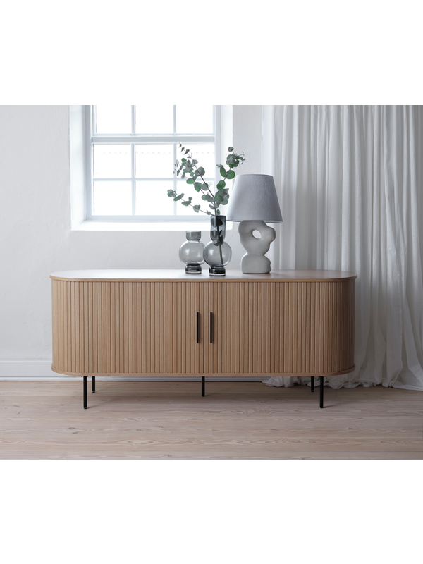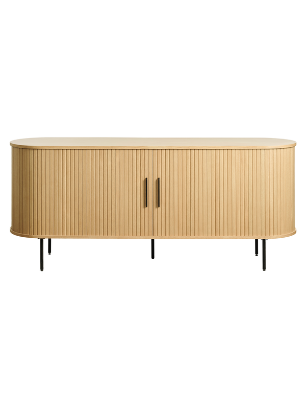 Dressoir Barber is de ideale kast om je spullen in op te bergen. De kast wordt gekenmerkt door zijn ronde hoeken, het lijnenspel en de hoge pootjes die hem tot een stijlvolle en speelse kast maken. Achter de twee schuifdeuren bevinden zich verschillende vakken. De kast is gemaakt van eiken fineer gecombineerd met een zwart stalen pootjes en verkrijgbaar in naturel, wit, bruin en zwart. Barber is zelf eenvoudig te monteren en daardoor makkelijk voor transport.