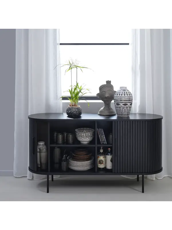 Dressoir Barber is de ideale kast om je spullen in op te bergen. De kast wordt gekenmerkt door zijn ronde hoeken, het lijnenspel en de hoge pootjes die hem tot een stijlvolle en speelse kast maken. Achter de twee schuifdeuren bevinden zich verschillende v