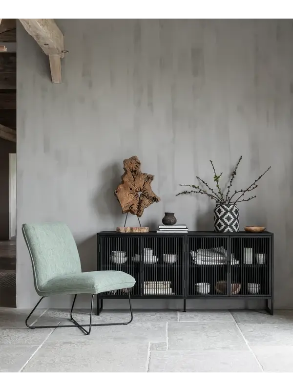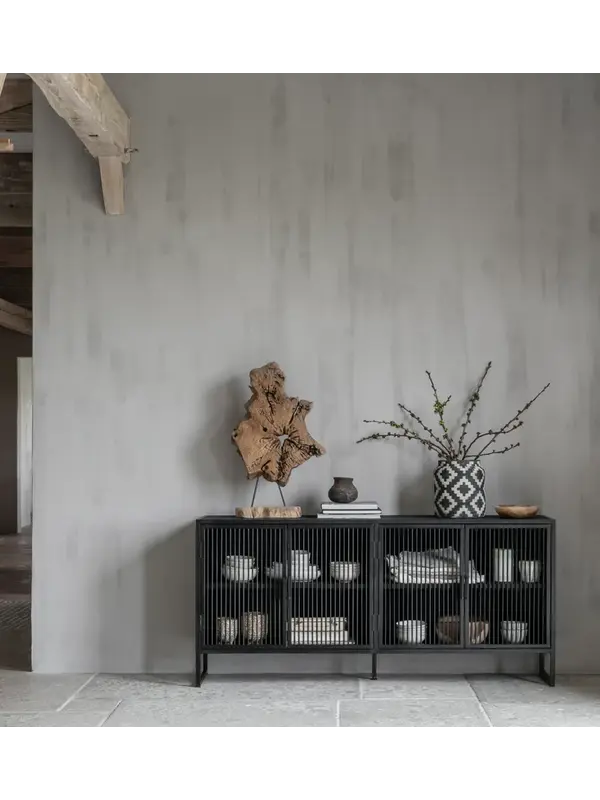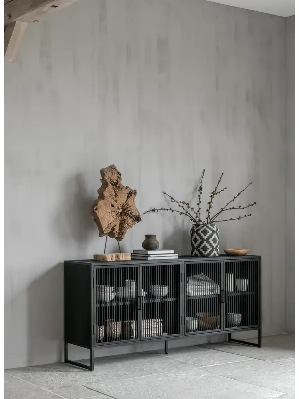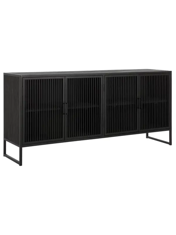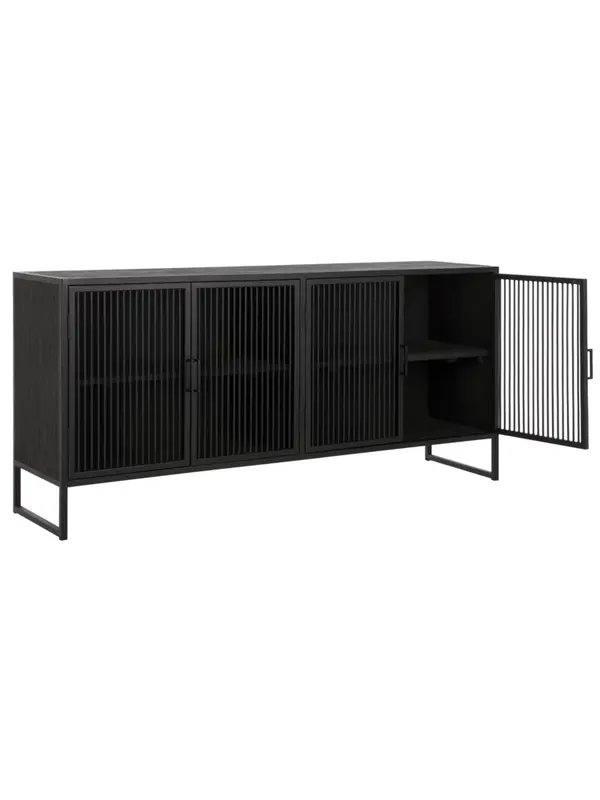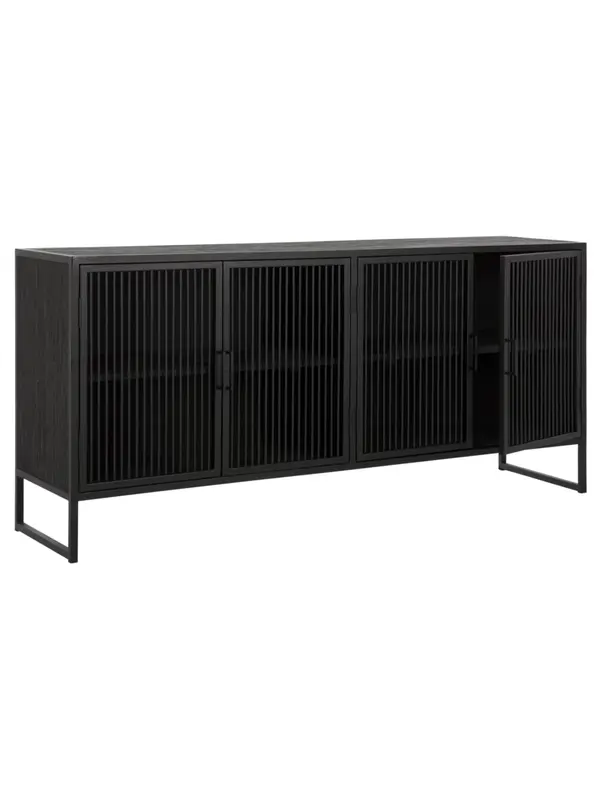 Dressoir Jailhouse is gemaakt van een combinatie van metaal en gerecycled hout. Deze meubels uit de Jailhouse collectie kenmerken zich door de wanden van metalen buizen. Deze buizen zorgen voor een speelse doorkijk en geven de meubels een luchtige uitstraling. De buitenzijde van het dressoir is gemaakt van zwart gebeitst gerecycled teakhout. Een prachtige combinatie met het zwarte metaal. Het dressoir heeft een afmeting van 75x160x40 cm.