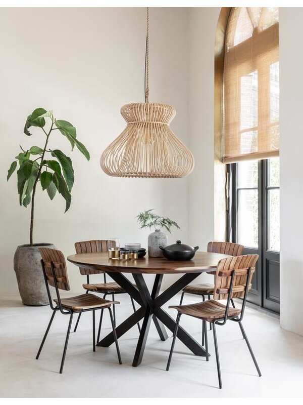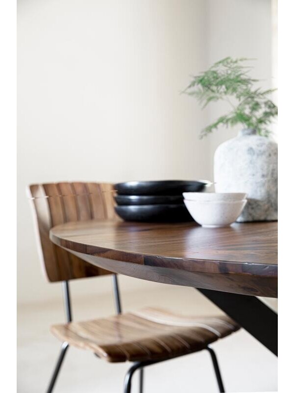 Eettafel Flare is gemaakt van het suarhout. Deze houtsoort is sterk, duurzaam en bovendien prachtig dankzij de talloze kleurverschillen en patronen. Suarhout heeft vaak een chocoladebruine kern, omringt door vlammende kleuren lichtbruin en geel. Het frame van de eettafel is gemaakt van zwart metaal met een gouden gloed. Dit complimenteert het warme suarhout en zorgt ervoor dat de eettafel een gezellige, huiselijke uitstraling krijgt. Eettafel Flare heeft een afmeting van 78xØ130 cm.