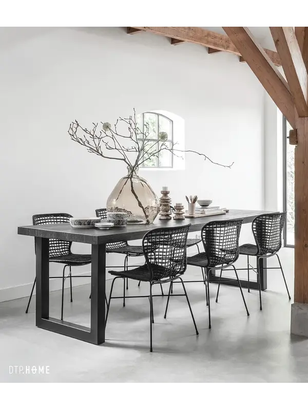 Eettafel Night heeft een zwartgelakt, houten blad dat fantastisch combineert met de robuuste, stalen u-poot. Dankzij de zwarte kleur en het neutrale uiterlijk van eettafel Night combineer je hem gemakkelijk met verschillende kleuren, materialen en interie