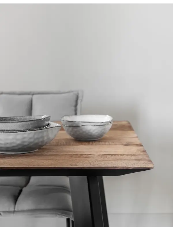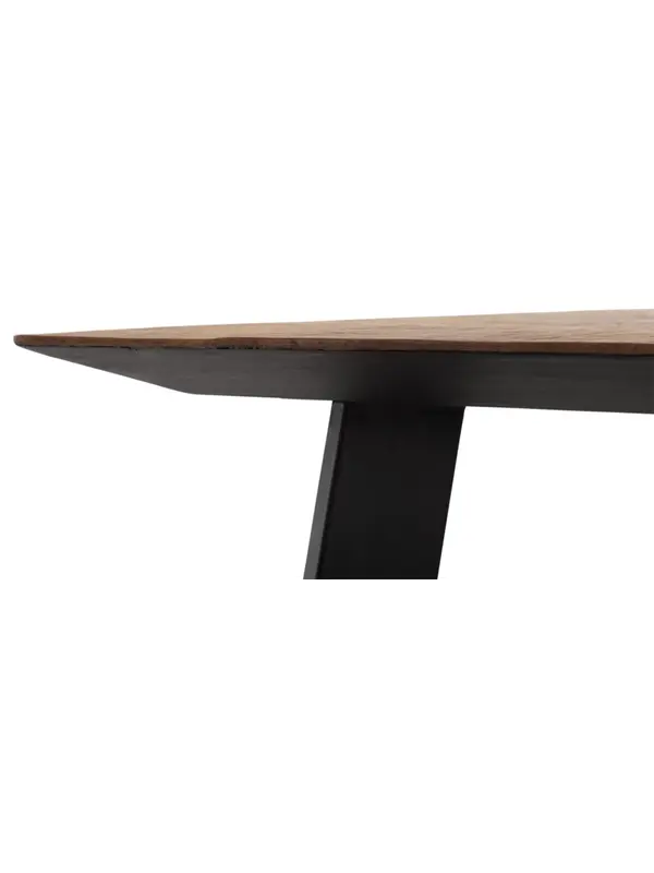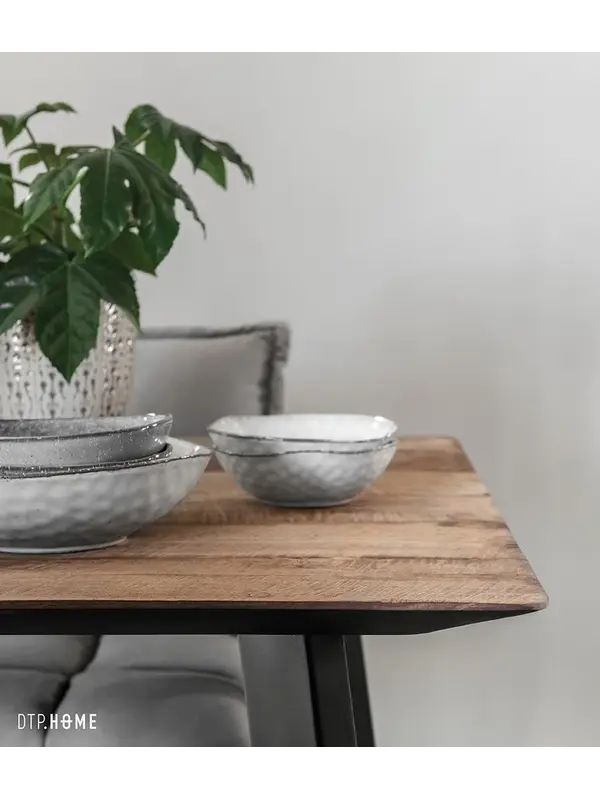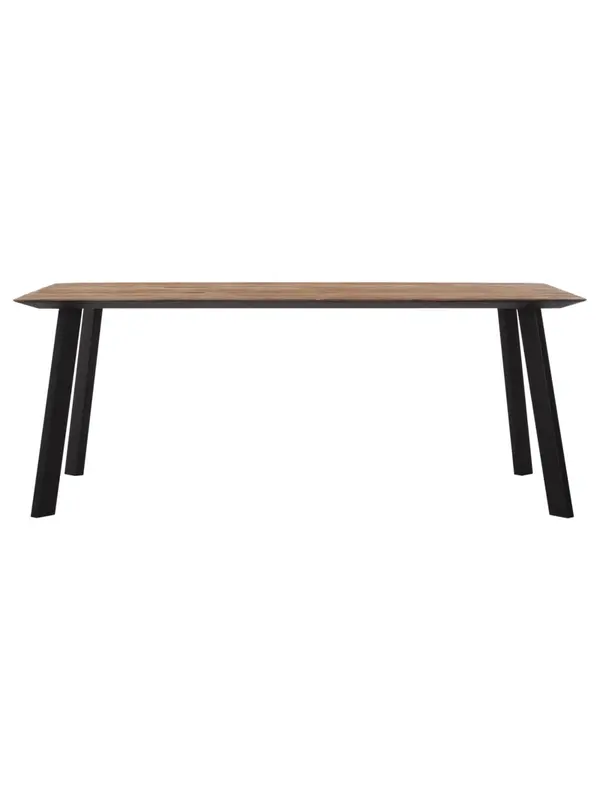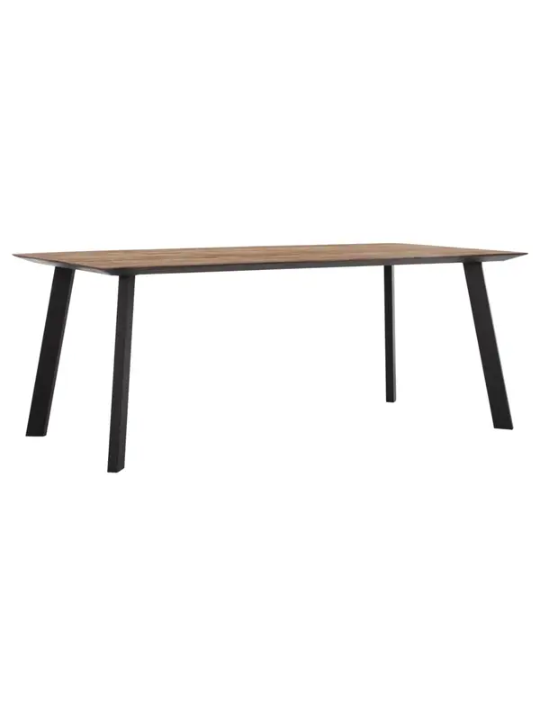 De teakhouten tafelbladen in de Timeless collectie van het merk DTP Home zijn verjongd. Het hout loopt schuin af naar onder waardoor de hele tafel lijkt te zweven. De ranke meubels die zo ontstaan vormen een prettig contrast met de andere helft van de col