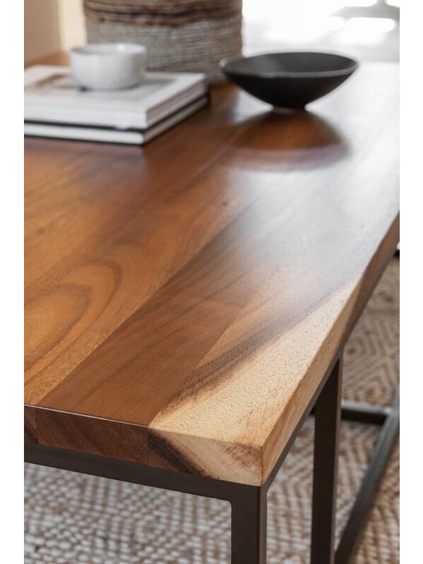 Salontafel Flare is gemaakt van het suarhout. Deze houtsoort is sterk, duurzaam en bovendien prachtig dankzij de talloze kleurverschillen en patronen. Suarhout heeft vaak een chocoladebruine kern, omringt door vlammende kleuren lichtbruin en geel. Het frame van de salontafel is gemaakt van zwart metaal met een gouden gloed. Dit complimenteert het warme suarhout en zorgt ervoor dat de salontafel een gezellige, huiselijke uitstraling krijgt. Salontafel Flare heeft een afmeting van 35x130x80 cm.