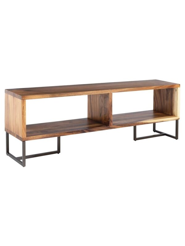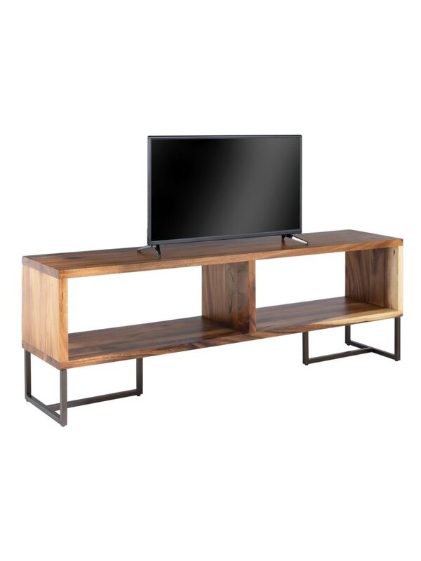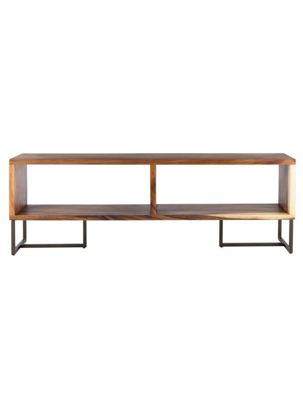 Tv-meubel Flare is gemaakt van het suarhout. Deze houtsoort is sterk, duurzaam en bovendien prachtig dankzij de talloze kleurverschillen en patronen. Suarhout heeft vaak een chocoladebruine kern, omringt door vlammende kleuren lichtbruin en geel. Het frame van het tv-meubel is gemaakt van zwart metaal met een gouden gloed. Dit complimenteert het warme suarhout en zorgt ervoor dat het tv-meubel een gezellige, huiselijke uitstraling krijgt. Tv-meubel Flare heeft een afmeting van 55x160x35 cm en is demonteerbaar.