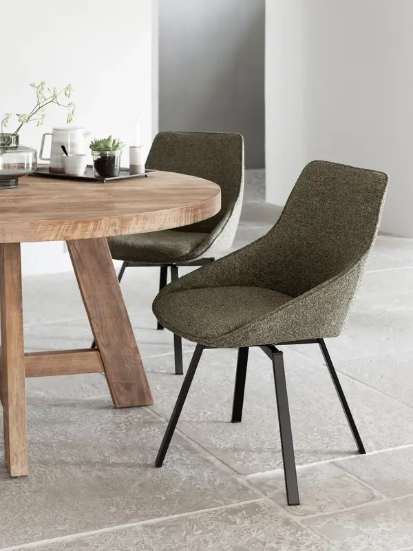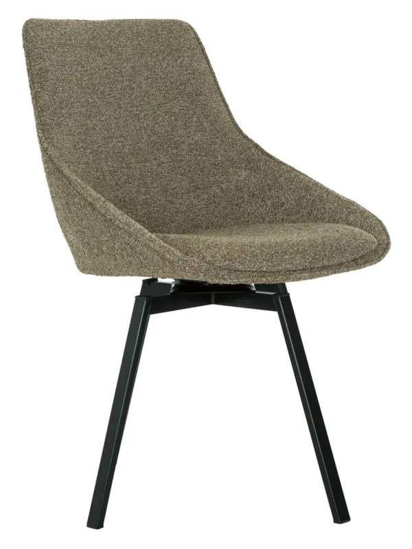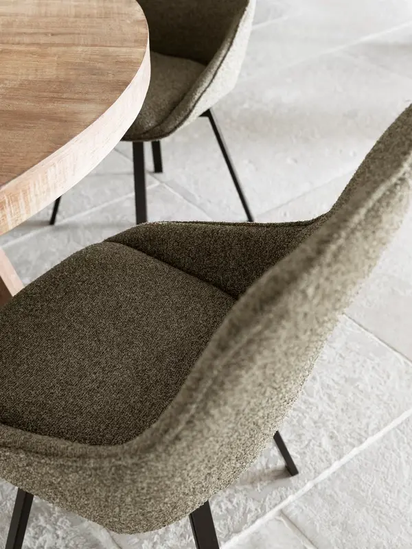 Met eetkamerstoel Glamour kan je alle kanten op. De draaibare zitting geeft extra comfort en daardoor is hij ook ideaal als bureaustoel. Naast velvet en corduroy is bouclé nu trending. De stof met lusjes is stevig maar ook elegant, en was daarom een grote