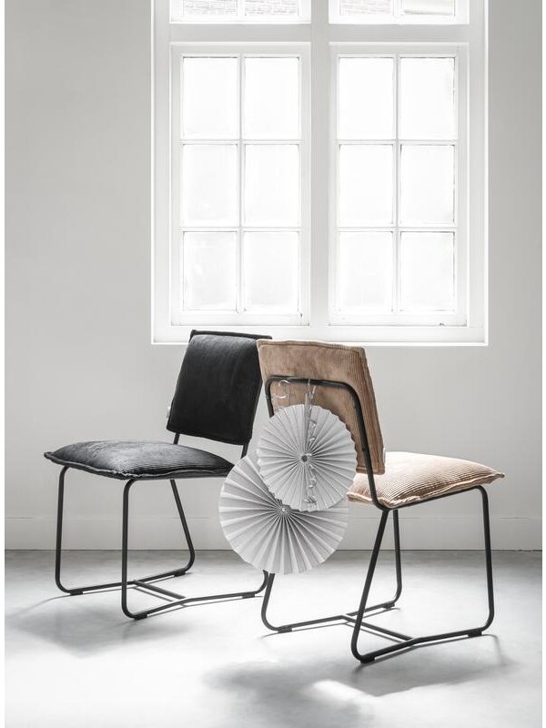 Deze moderne stoel is bekleed met een zachte ribstof in vier aardse kleuren. Deze stof zag je al in de jaren 70, maar is inmiddels weer helemaal van nu. Het frame van de stoel vormt aan de achterzijde een handgreep waardoor je de stoel gemakkelijk aan tafel schuift. Combineer je eetkamerstoel met fauteuil Lotus en eetkamerbank Mirage, verkrijgbaar in dezelfde kleuren.