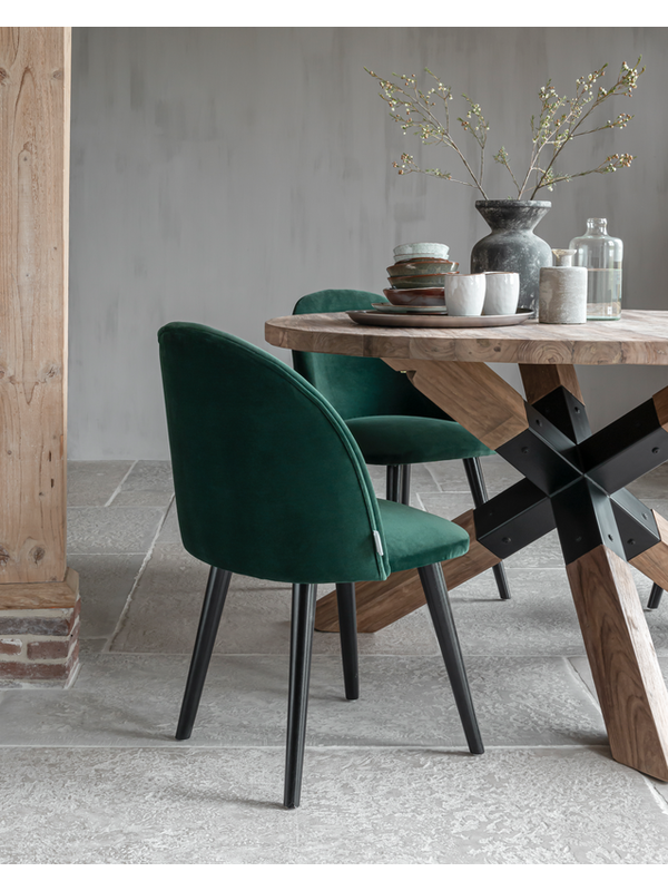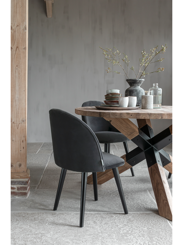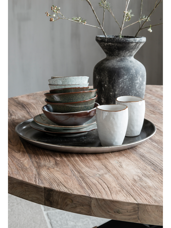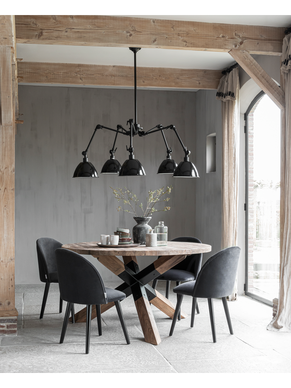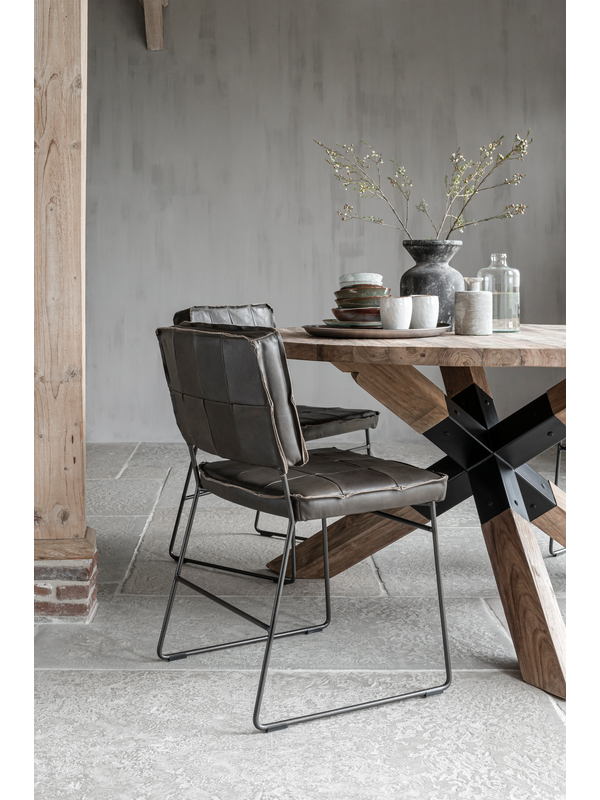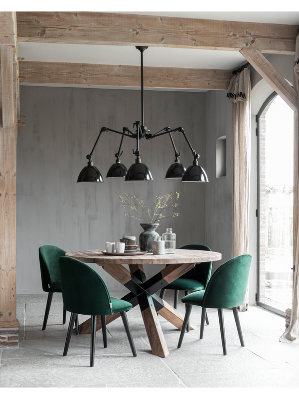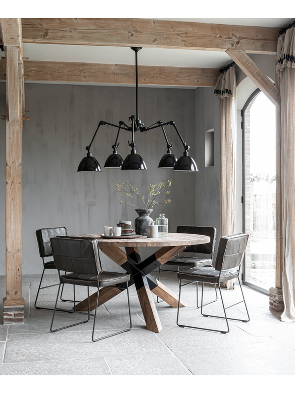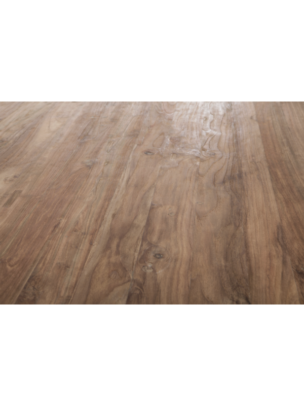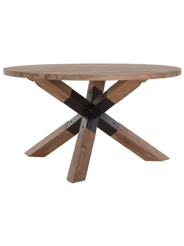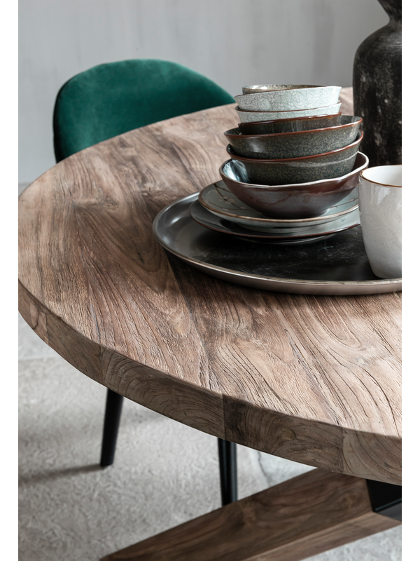 Eettafel Medan is een unieke verschijning. De eettafel is gemaakt van gerecycled teakhout, waarbij de nerven van het hout goed zichtbaar zijn gebleven. De poten hebben een bijzondere combinatie van hout en metaal, waardoor eetkamerstoelen met metalen poten fijn combineren met de tafel. De tafel heeft een afmeting van 78xØ140 cm.
