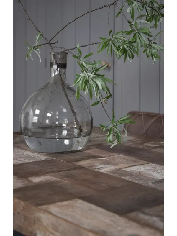 Eettafel Pure heeft een afmeting van 78x200x100 cm en is hiermee groot genoeg voor ongeveer 6 personen. Het tafelblad van de eettafel is gemaakt van gerecycled teakhout, afgewerkt met een verweerde verflaag. Pure wordt gedragen door een in zwart gepoederc