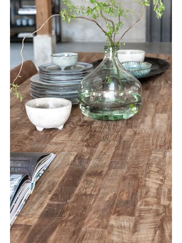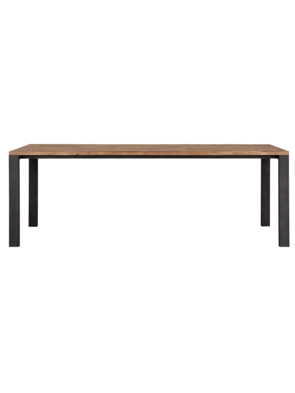 Eettafel Stripes heeft een blad gemaakt van gerecycled teakhout wat ervoor zorgt dat elke tafel zijn eigen unieke uitstraling heeft. Het stalen frame zorgt voor genoeg ruimte voor de eetkamerstoelen.