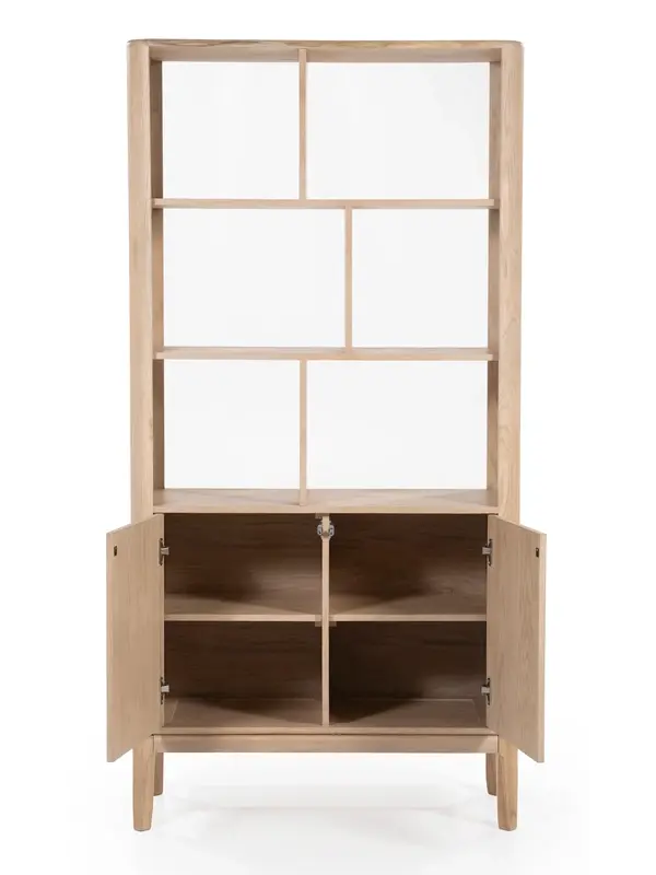 Boekenkast Harvey van het Nederlandse merk Eleonora heeft een Scandinavisch design. De kast is gemaakt van eikenhout en afgewerkt met een transparante laklaag. De greeploze deuren, met daarachter vier vakken, bieden genoeg opbergruimte. En met zes open va