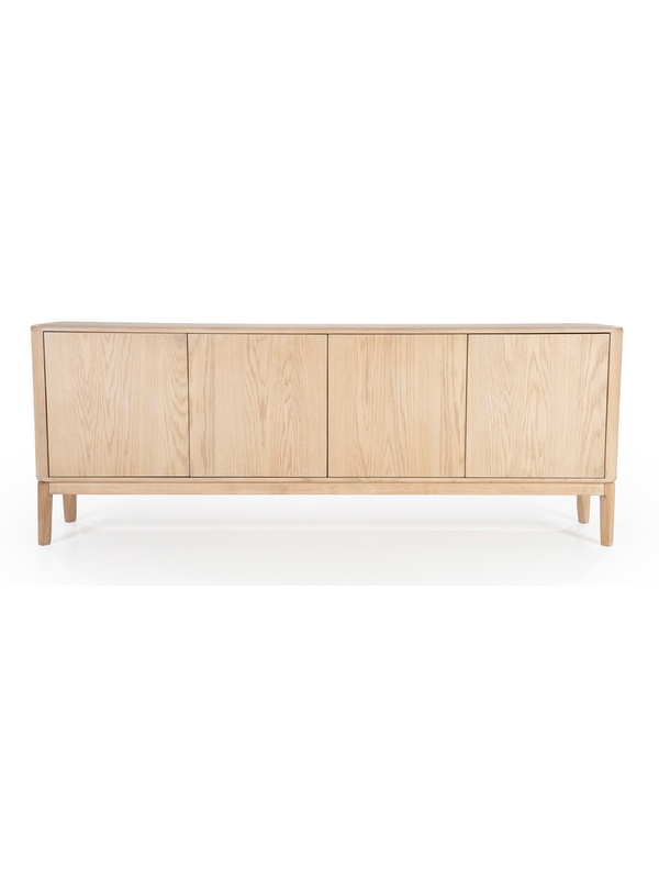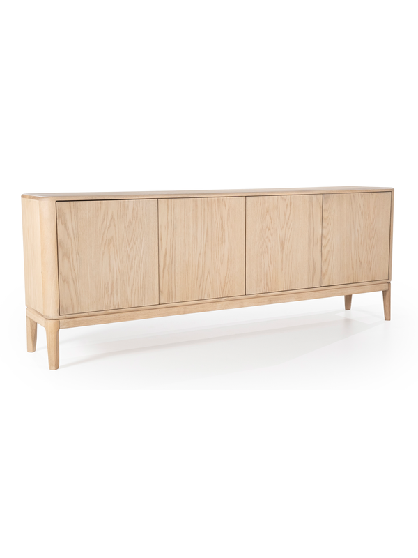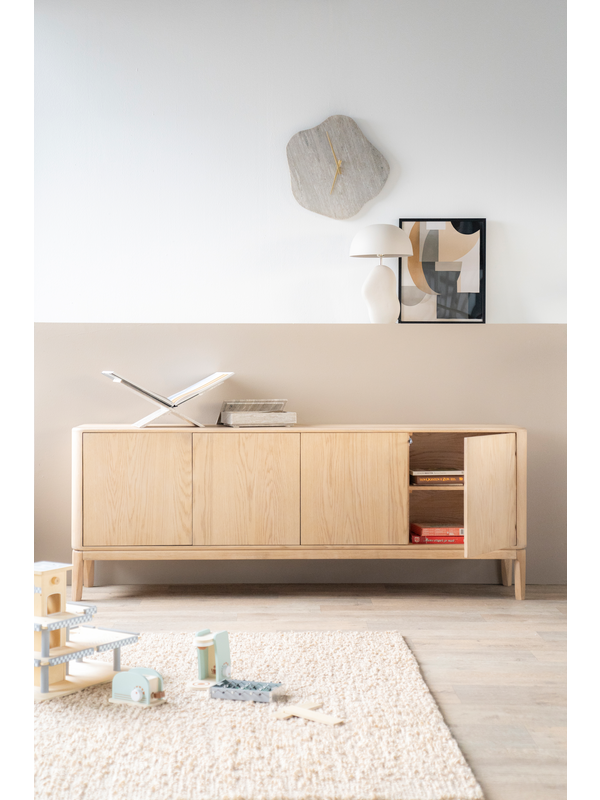 Dressoir Harvey van het Nederlandse merk Eleonora heeft een Scandinavisch design. Het meubel is gemaakt van eikenhout en afgewerkt met een transparante laklaag. De greeploze deuren, met daarachter acht vakken, bieden genoeg opbergruimte. De hoge poten en afgeronde hoeken geven de kast een luchtige en zachte uitstraling. Combineer dressoir Harvey met de andere meubels uit de Harvey serie.