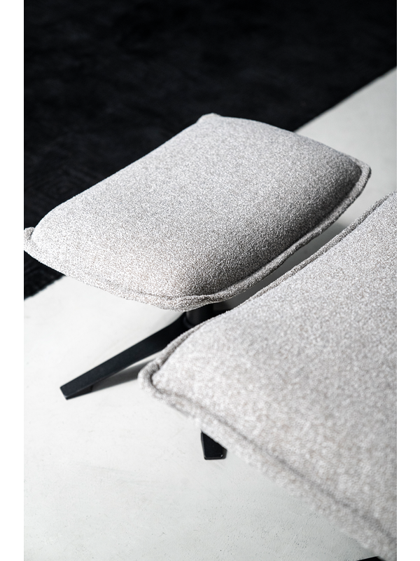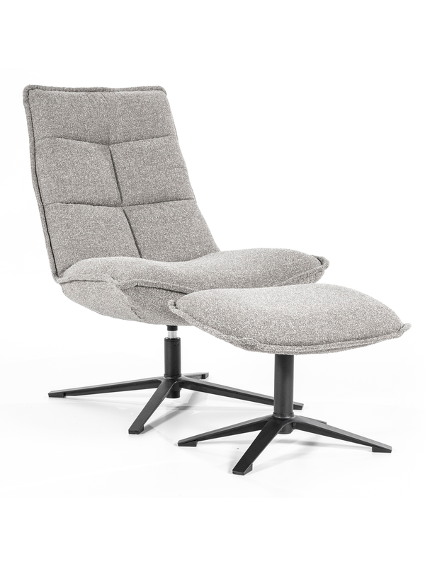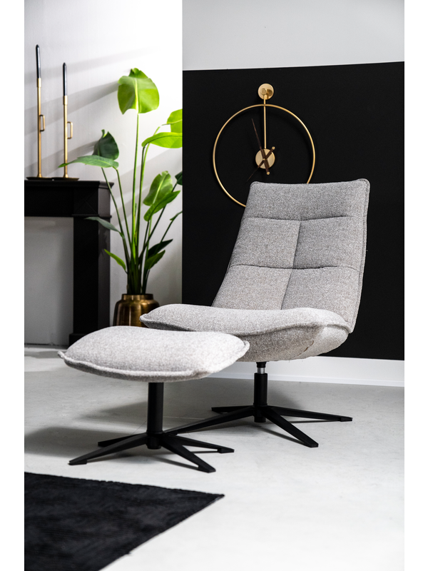 De draaifauteuil Martin en de bijpassende voetenbank zijn ideaal na een lange werkdag of om een hele dag lekker in te vertoeven. Beide zijn bekleed met een zachte bouclé stof voor ultiem comfort. De fauteuil is in twee verschillende kleuren verkrijgbaar; beige en lichtgrijs. De afmetingen van de fauteuil zijn 94x67x92 cm en van de voetenbank zijn 40x54x41 cm.