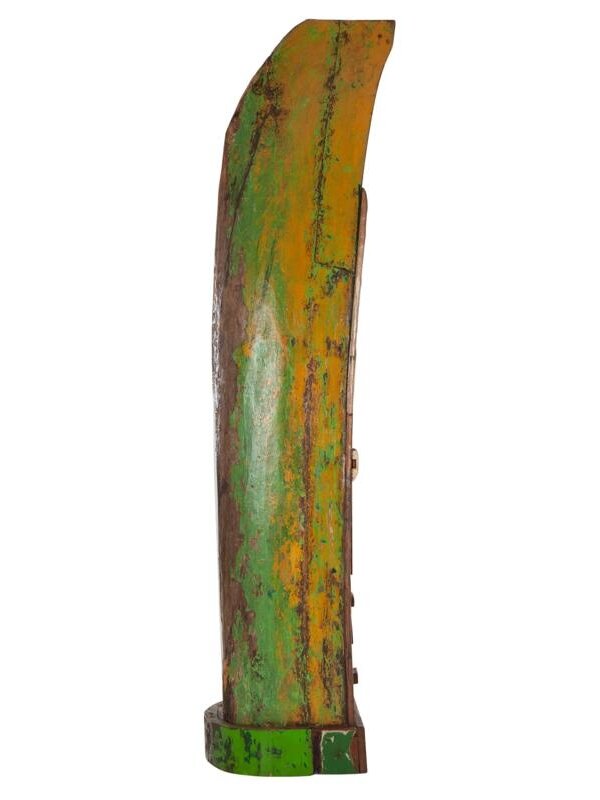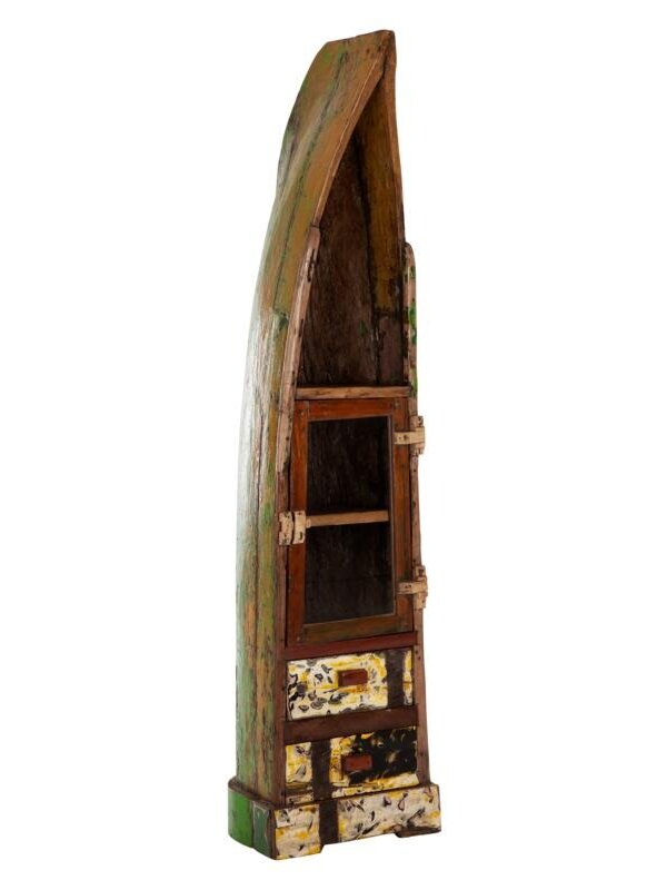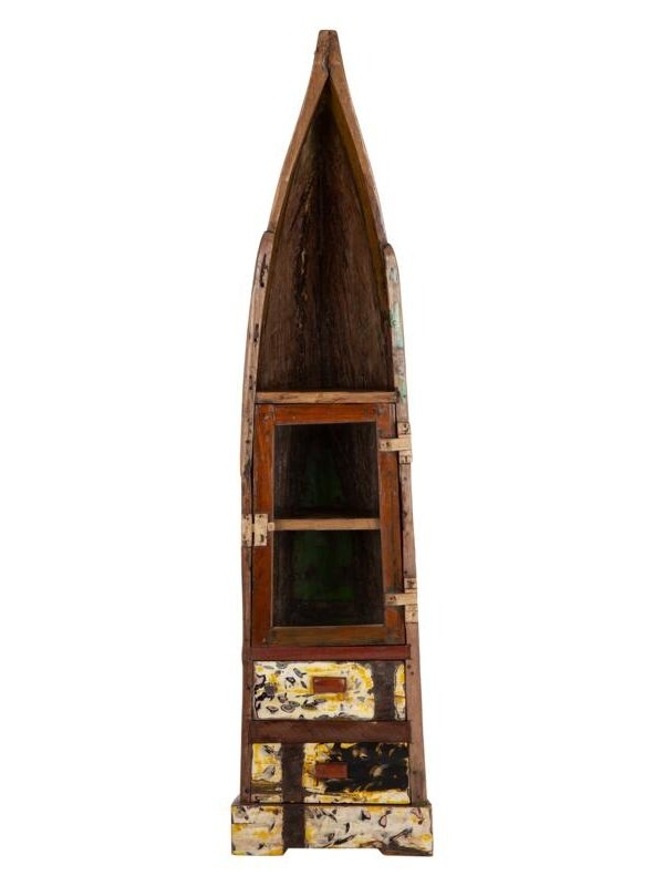 Met kanokast Peddel haal je echt iets bijzonders in huis. Deze gave kast in de vorm van een halve kano is gemaakt van verschillende soorten hout en beschikt over één deurtje, drie vakken en twee lades. Omdat de kanokasten met de hand worden gemaakt, zijn ze allemaal anders. Een unieke eyecatcher, dus! Kanokast Peddel heeft een afmeting van 200x35x45 cm.