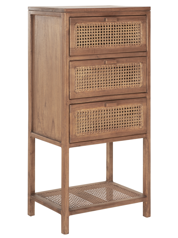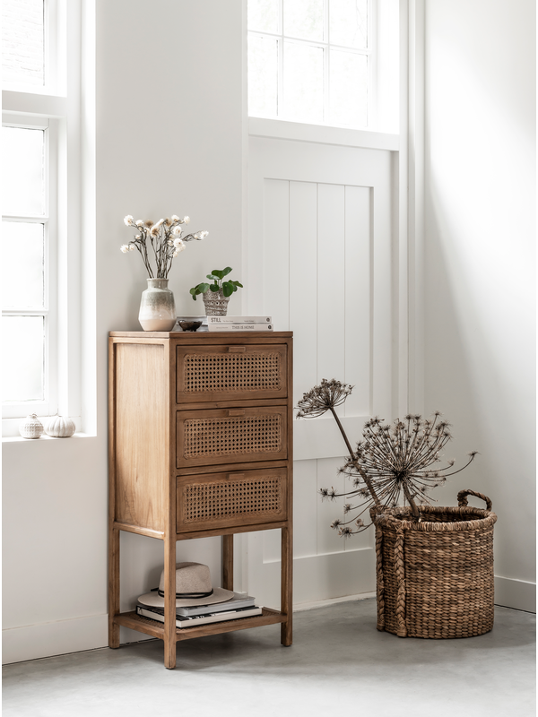 Ladekast Copenhagen is gemaakt van massief mindi hout van A-kwaliteit en is afgewerkt met handgevlochten webbing. Webbing is gemaakt van gevlochten rattan. De laden zijn voorzien van een dubbele laag webbing, waardoor de kast ook aan de binnenzijde perfect is afgewerkt. Een mooi detail is het zichtbare webbing onderblad. Ladekast Copenhagen is voorzien van 3 laden en heeft een afmeting van 115x45x40 cm.