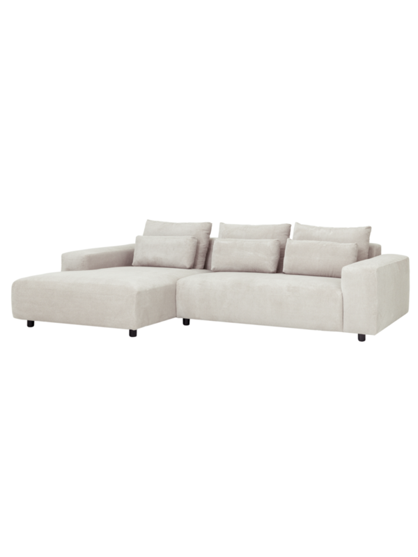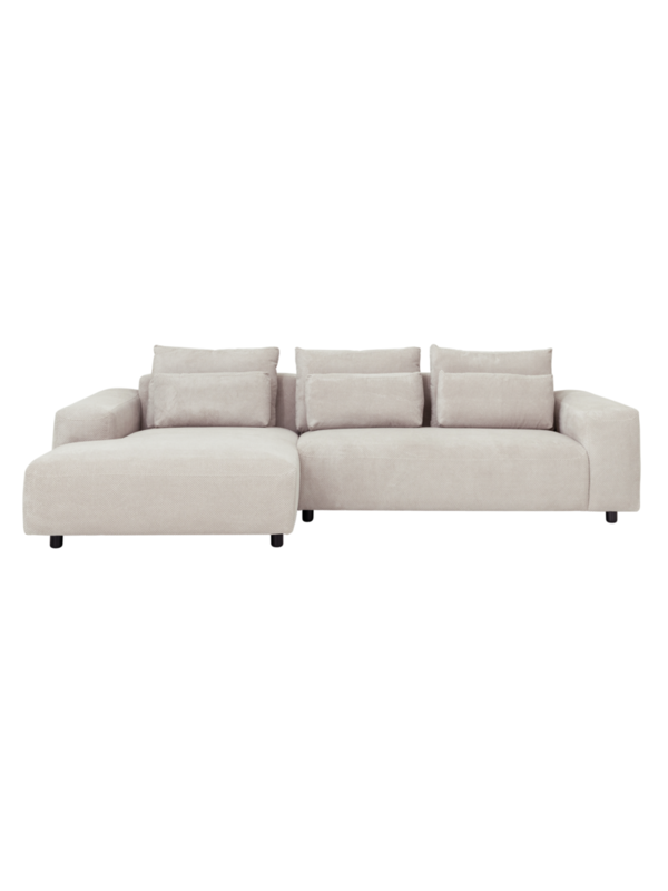 Loungebank Naomi gunt je een comfort waar je van kan genieten! De zachte ecru stof geeft een luxe uitstraling en met de verschillende kussens kan je makkelijk van houding veranderen, of je nou liever relaxter of actiever zit. De opstelling is ook gespiegeld verkrijgbaar. De afmetingen van de bank zijn 284x176 cm en wordt geleverd inclusief rug- en lendekussens.