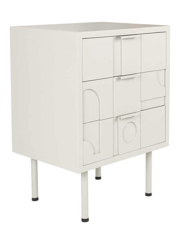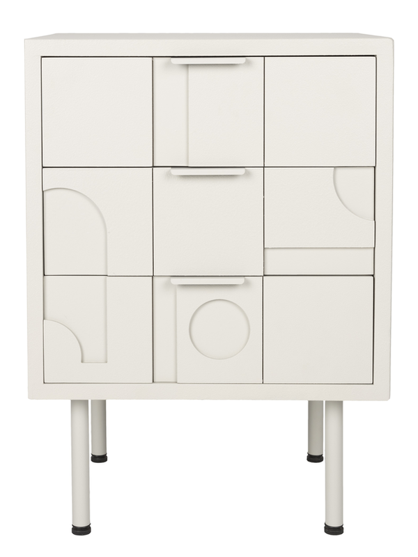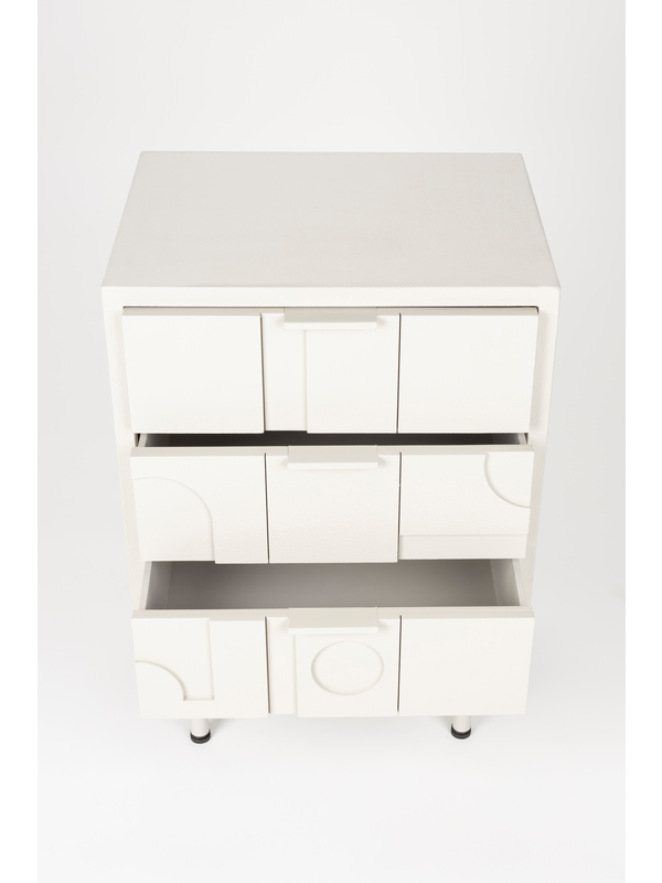 De opvallende 3D-deuren met organische vormen vormen het hart van de Disco-serie. Deze vernieuwende deuren vallen direct op en brengen een unieke dynamiek in je interieur. De zachte off-white tint straalt rust en elegantie uit, waardoor de meubels naadloos in elk interieur tot hun recht komen. Ook verkrijgbaar in een dressoir en bergkast. De afmetingen zijn 71x40x50 cm.