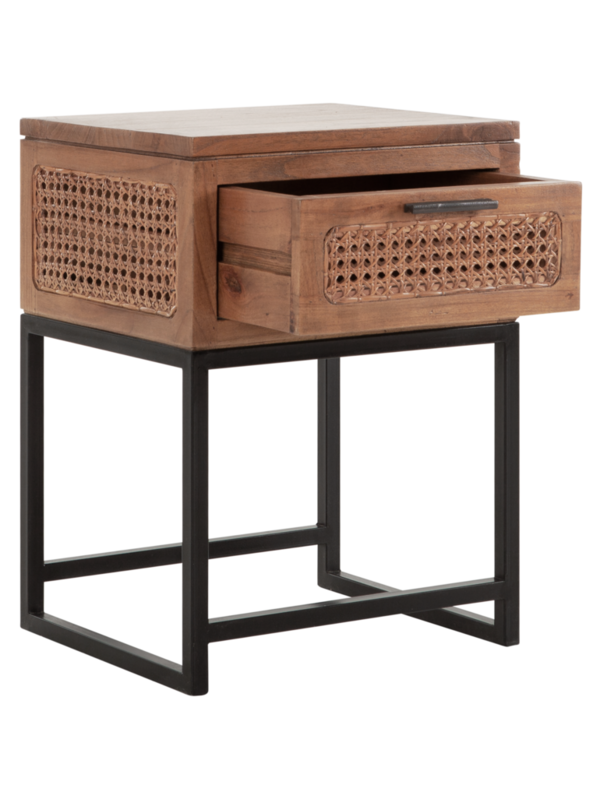 Nachtkastje Dromenland combineert warm, sfeervol hout met een zwartstalen onderstel. Het nachtkastje beschikt over één lade, afgewerkt met webbing. Deze prachtige samenstelling van verschillende materialen zorgt ervoor dat Dromenland in nagenoeg iedere interieurstijl tot zijn recht komt. Stoer, industrieel, trendy én een tikkeltje bohémien: nachtkastje Dromenland is het allemaal. Het nachtkastje heeft een afmeting van 55x40x35 cm.