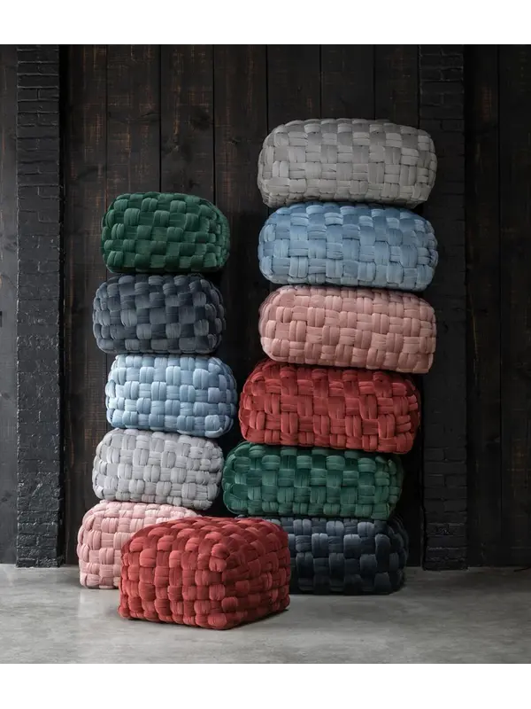 Poef Weave schuif je makkelijk bij de bank om een extra zit plek te creëren of om heerlijk je benen te laten ontspannen. De poef is bekleed met een zachte velvet stof en en straalt comfort uit! Verkrijgbaar in de kleuren wijnrood, roze, groen, blauw, lichtgrijs en donkergrijs. Combineer de verschillende kleuren en afmetingen met elkaar voor een speels effect.