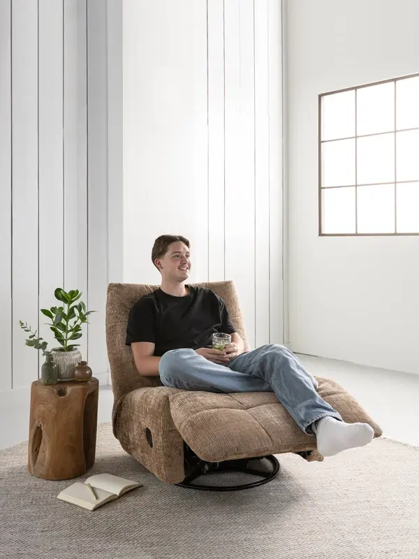 Relaxfauteuil Tranquilo is een handmatig verstelbare fauteuil met een uitklapbare voetensteun die alles biedt voor ultieme ontspanning. Dankzij de soepele draaifunctie en de rustgevende wiebelbeweging beweeg je moeiteloos mee met de ruimte, terwijl je met het handmatige verstelsysteem eenvoudig wisselt tussen zit- en relaxposities.