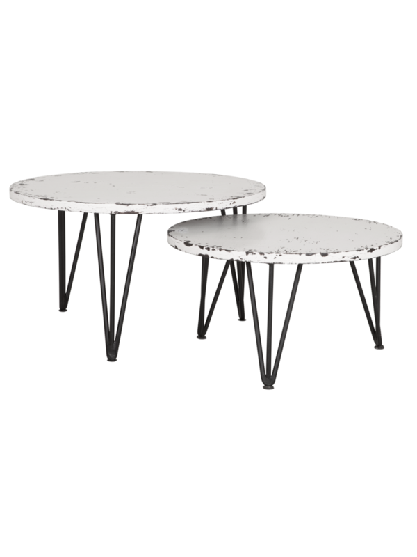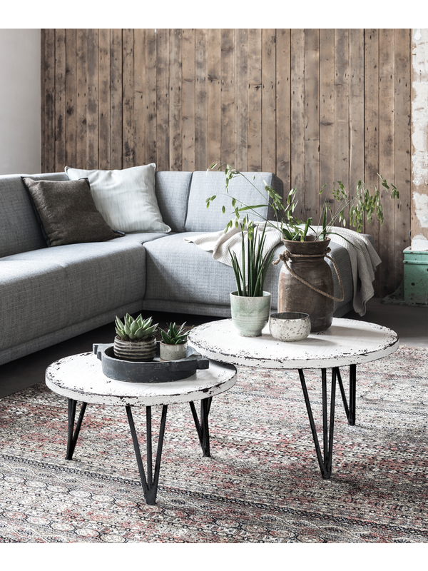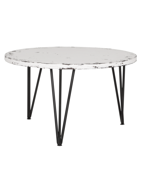 De salontafel is voorzien van een antieke witte finish en is afgewerkt met moderne zwarte pootjes. Salontafel Ghost heeft een afmeting van 36xØ65 cm.