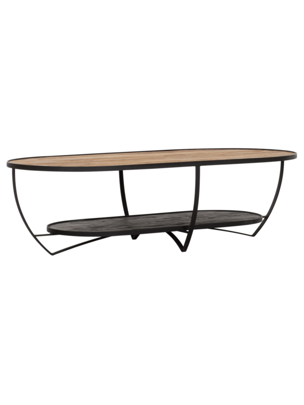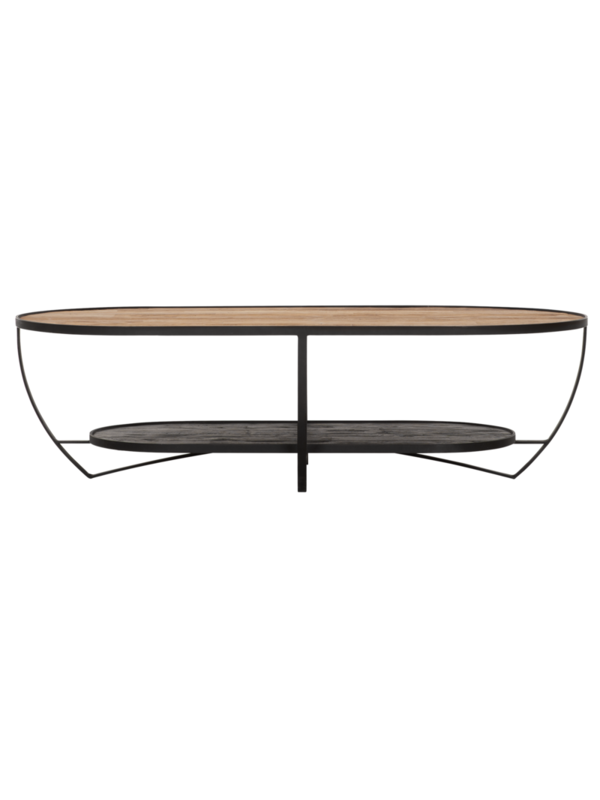 Salontafel Moon heeft een bijzonder uiterlijk! Zowel het bovenste als het onderste blad zijn gemaakt van robuust teakhout, waarbij de eerste naturel is gelaten en de tweede zwart is geverfd. De twee bladen worden verbonden door een luchtig stalen frame met hoekige details. Salontafel Moon is een stoere en industriële tafel. Salontafel Moon heeft een afmeting van 35x120x60 cm.