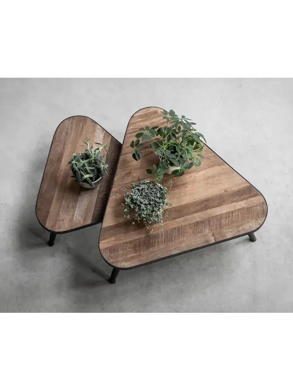 Ga eens voor iets anders dan een ronde of vierkante salontafel. Salontafel set Triangle heeft een driehoekig ontwerp. Dankzij het hoogte verschil schuif je de tafels gemakkelijk onder elkaar wanneer je ruimte wilt besparen.