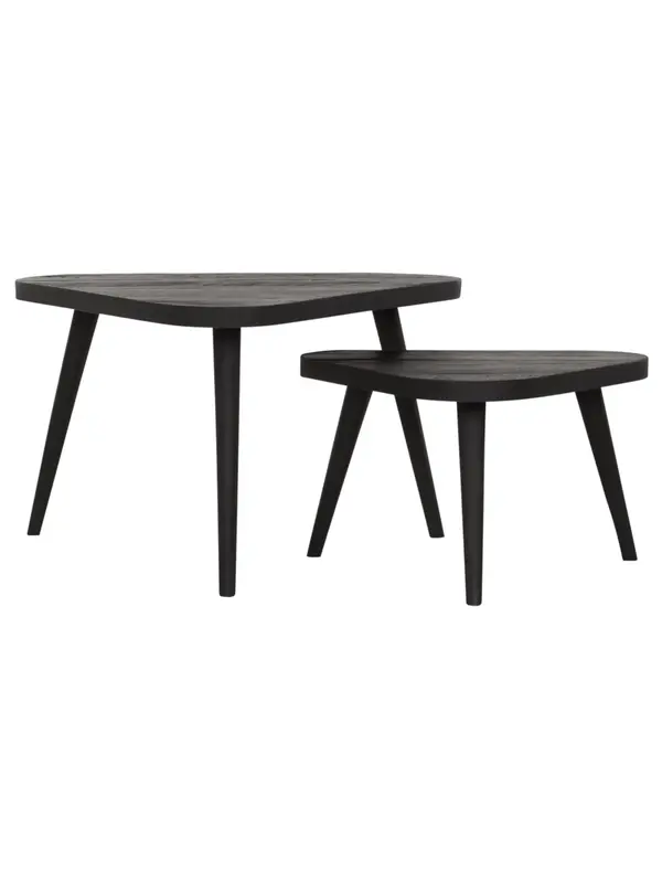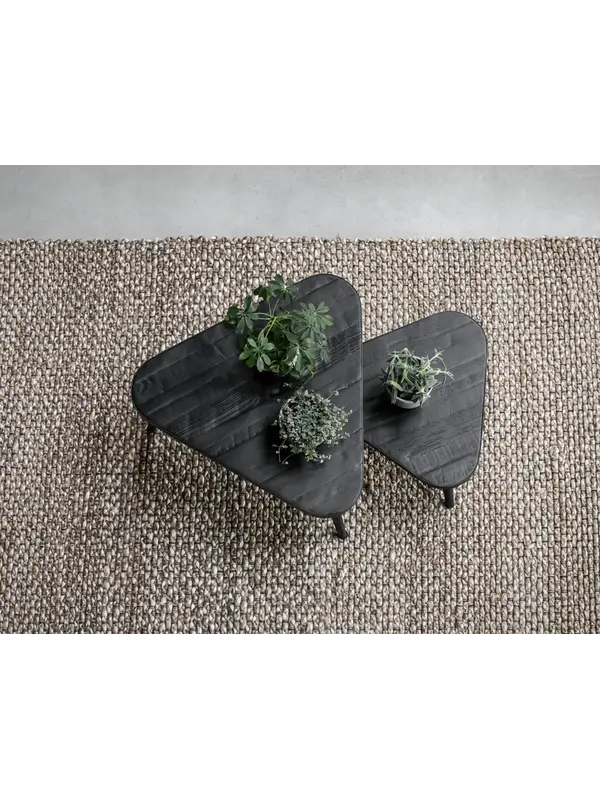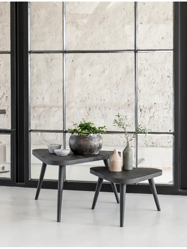 Salontafel Triangle is gemaakt van gerecycled teakhout, met een donkergrijs metalen frame. De set van 2 heeft een afmeting van 30x55x55 cm / 40x75x75 cm. Deze bijzondere set is verkrijgbaar in naturel en zwart teakhout. Dankzij het slimme ontwerp schuif je de tafels gemakkelijk onder elkaar. Ook los van elkaar zijn ze handig te plaatsen in iedere ruimte.