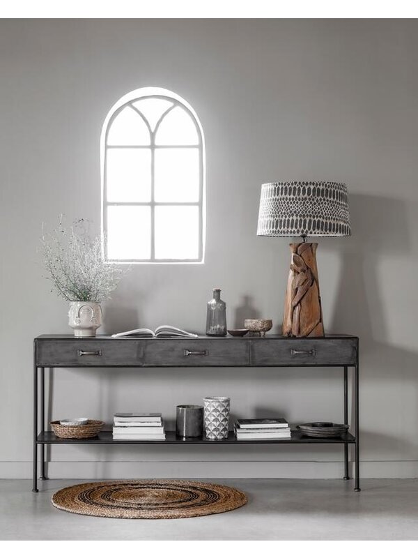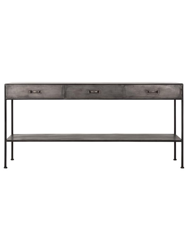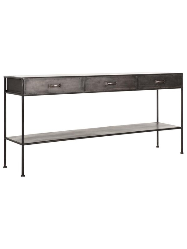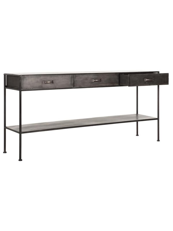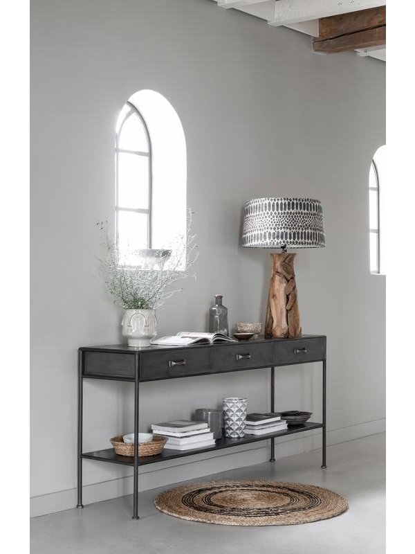 Sidetable Hampton is volledig gemaakt van zwart staal. Dit maakt de tafel industrieel en stoer. Maar door hem te combineren met warme materialen en zachte kleuren voelt hij zich thuis in elke interieurstijl. Zet er je mooiste woonaccessoires op, hang er een grote spiegel of schilderij boven en maak het een blikvanger in je hal of woonkamer. Sidetable Hampton heeft een afmeting van 80x171x40 cm en beschikt over drie lades.