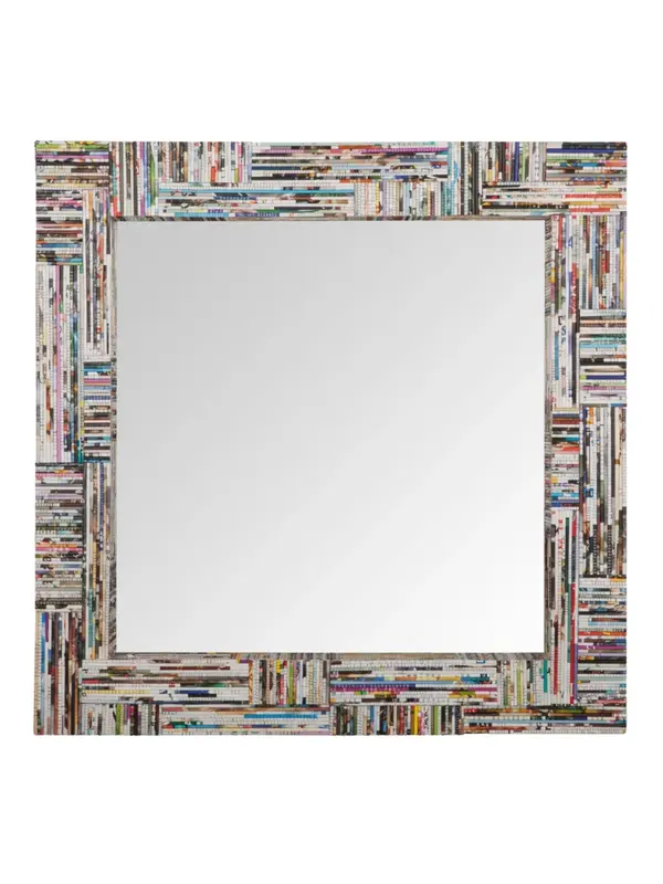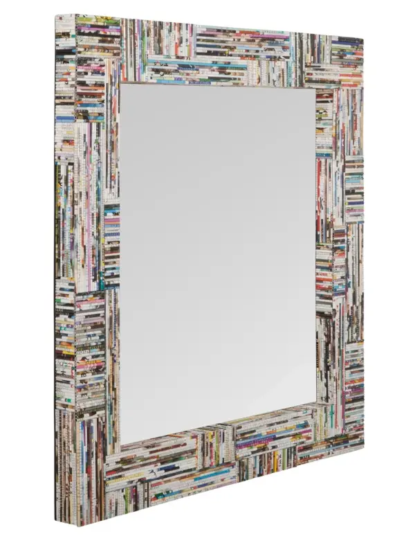 Deze super leuke spiegel is echt een one of a kind! Het ontwerp is een kunstzinnige mix van verschillende kleuren en patronen, wat zorgt voor een levendige, dynamische uitstraling. Het lijkt net alsof het allemaal kleine stukjes snipsels uit een magazine of krant zijn die samen 1 geheel vormen. Het creëert een moderne en eclectische sfeer, waardoor het een statement piece is in elke ruimte. Perfect voor wie houdt van een creatieve en opvallende touch in zijn inrichting!