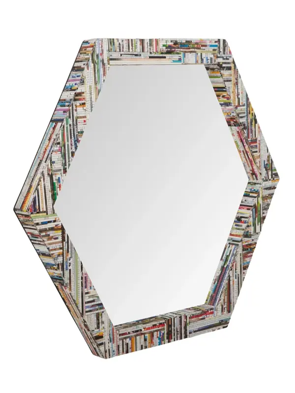 Deze super leuke spiegel is echt een one of a kind! Het ontwerp is een kunstzinnige mix van verschillende kleuren en patronen, wat zorgt voor een levendige, dynamische uitstraling. Het lijkt net alsof het allemaal kleine stukjes snipsels uit een magazine of krant zijn die samen 1 geheel vormen. Het creëert een moderne en eclectische sfeer, waardoor het een statement piece is in elke ruimte. Perfect voor wie houdt van een creatieve en opvallende touch in zijn inrichting!