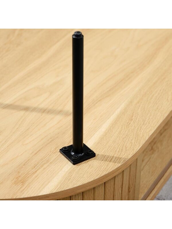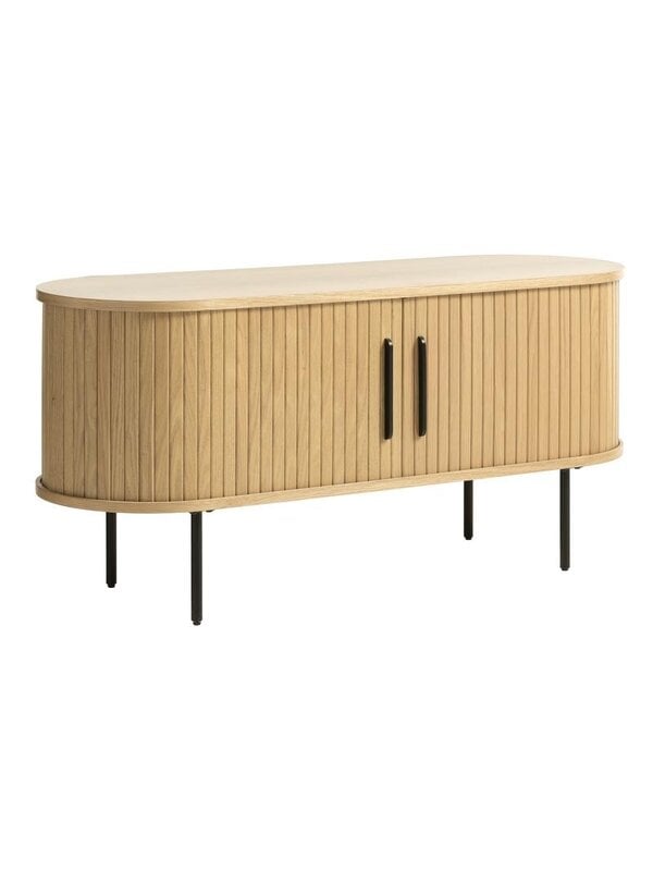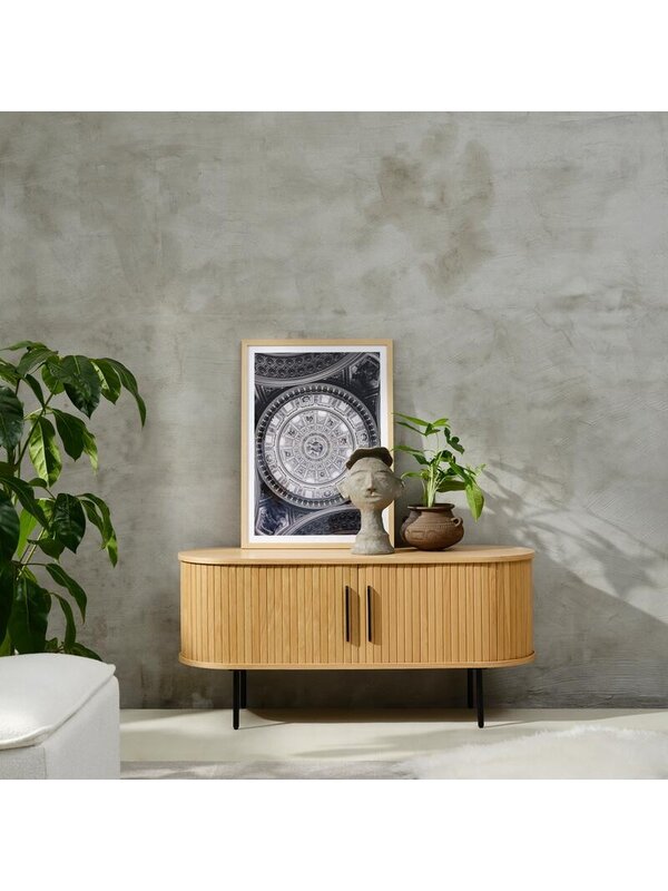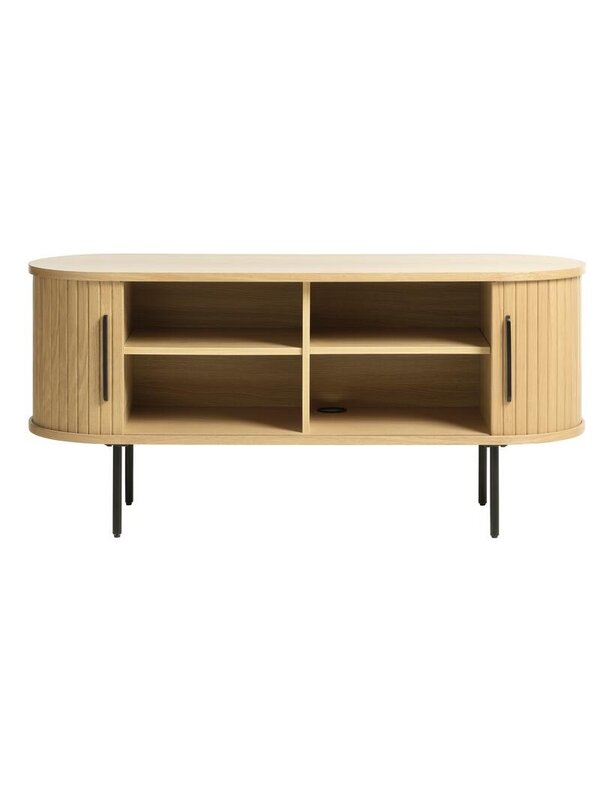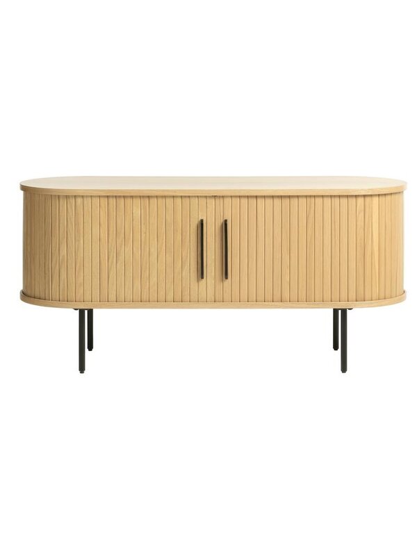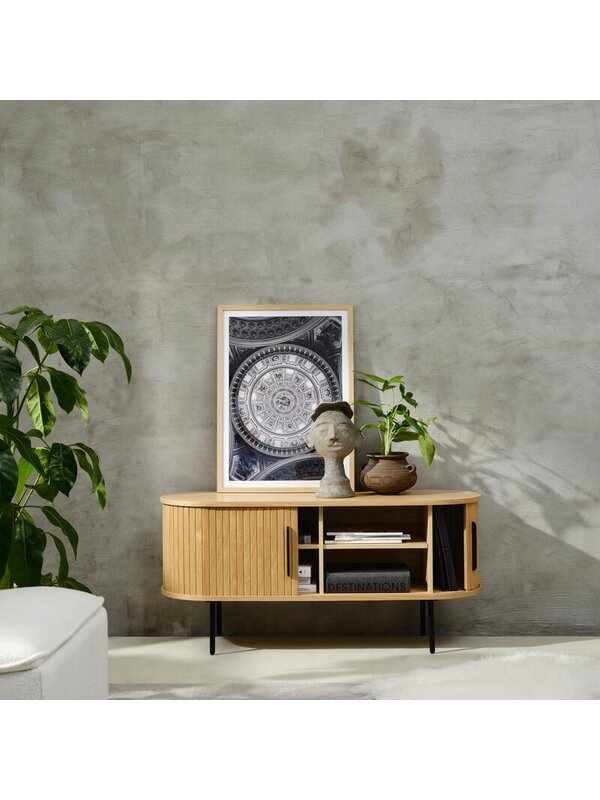 TV-meubel Barber is te gebruiken om je spullen in op te bergen, maar ook als tv-meubel. De kast wordt gekenmerkt door zijn ronde hoeken, het lijnenspel en de hoge pootjes die hem tot een stijlvolle en speelse kast maken. Achter de twee schuifdeuren bevinden zich verschillende vakken. De kast is gemaakt van eiken fineer gecombineerd met een zwart stalen pootjes en verkrijgbaar in naturel, wit, bruin en zwart. Barber is zelf eenvoudig te monteren en daardoor makkelijk voor transport.