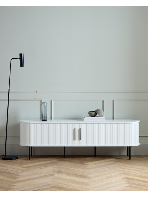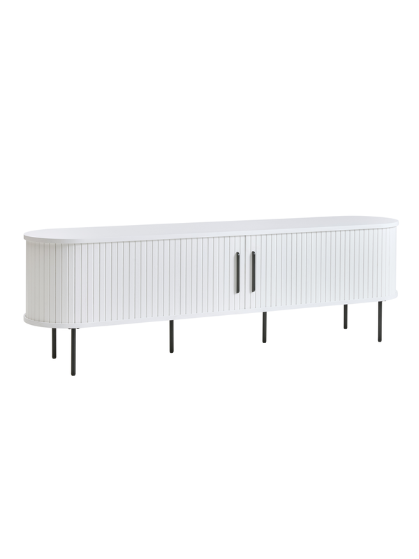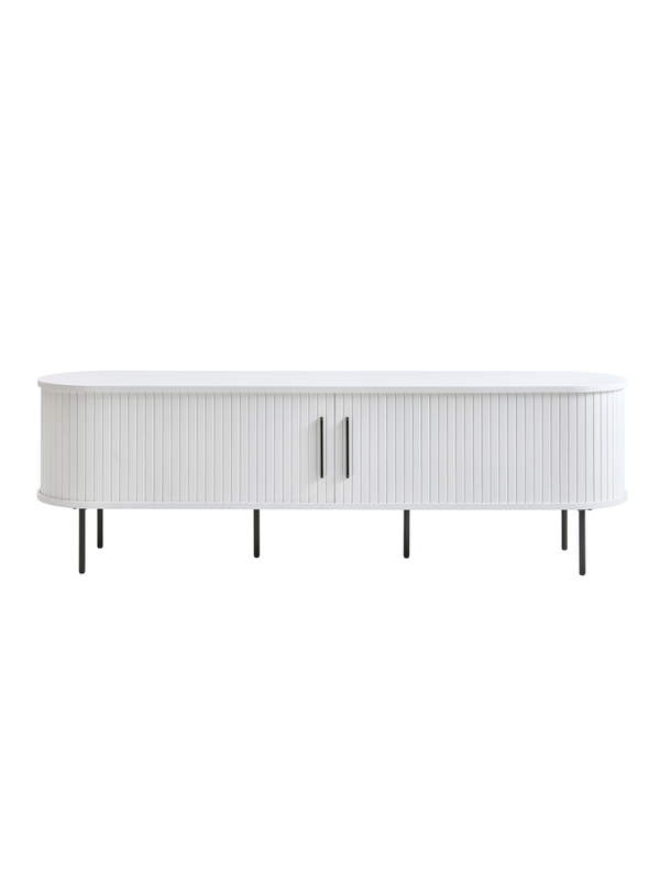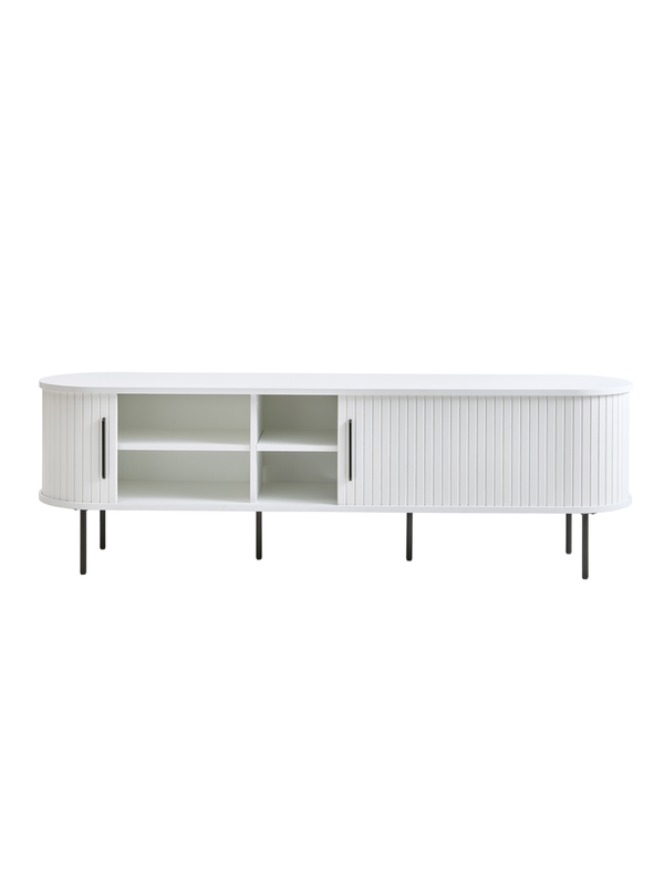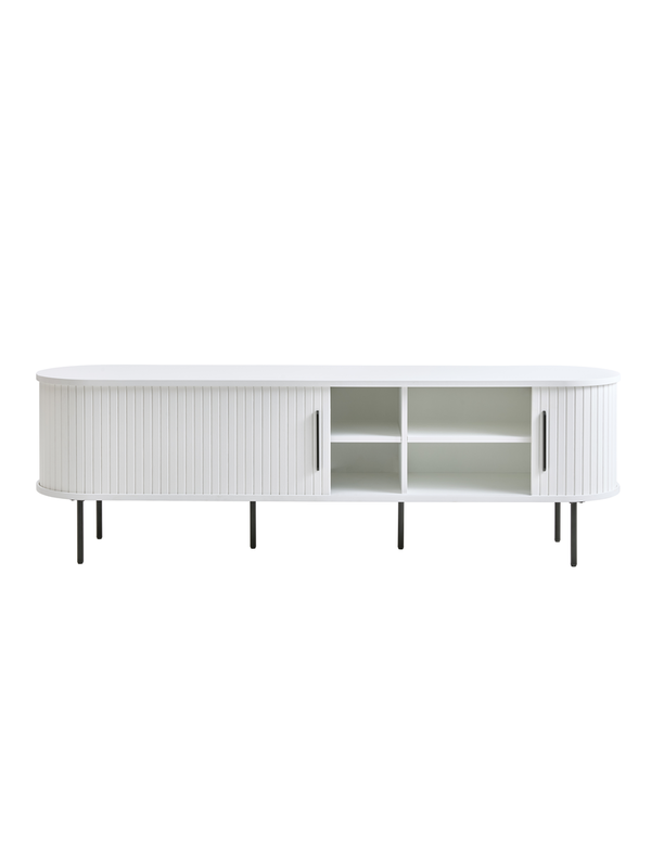 TV-meubel Barber is te gebruiken om je spullen in op te bergen, maar ook als tv-meubel. De kast wordt gekenmerkt door zijn ronde hoeken, het lijnenspel en de hoge pootjes die hem tot een stijlvolle en speelse kast maken. Achter de twee schuifdeuren bevinden zich verschillende vakken. De kast is gemaakt van eiken fineer gecombineerd met een zwart stalen pootjes en verkrijgbaar in naturel, wit, bruin en zwart. Barber is zelf eenvoudig te monteren en daardoor makkelijk voor transport.