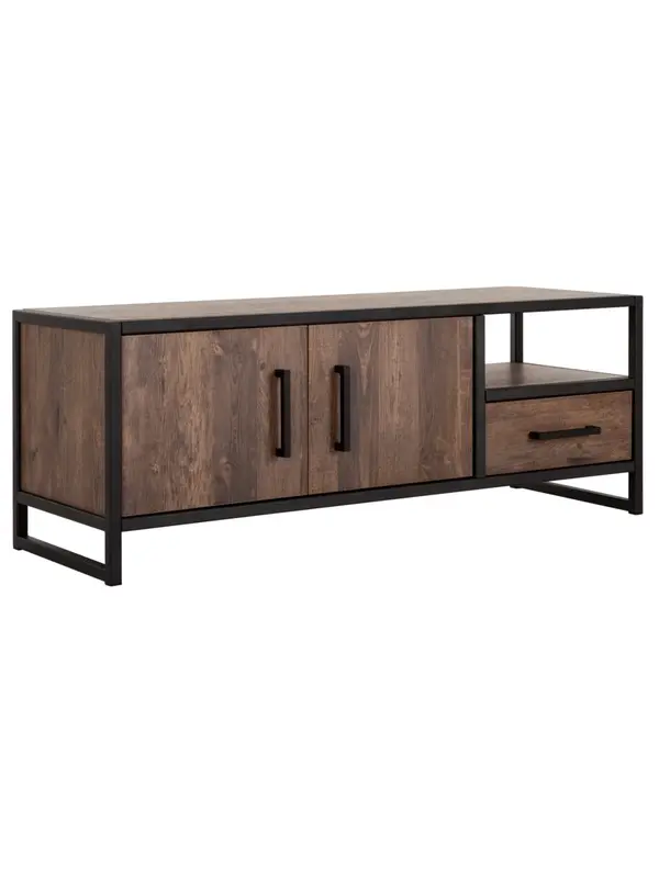Tv-meubel Bilbao heeft een stoer, doch warm en gezellig uiterlijk. Het meubel beschikt over frame van zwart metaal en wordt verder afgewerkt met plankjes en twee deurtjes van hout. Bilbao is strak, modern en gemakkelijk te combineren met andere kleuren en