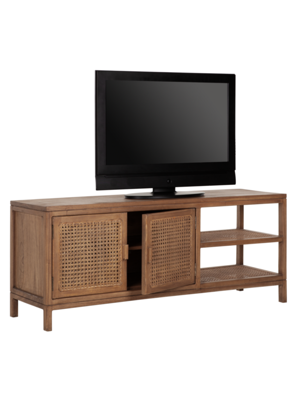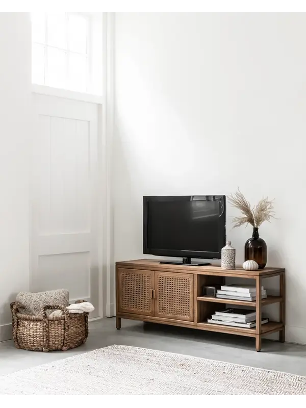 De meubels uit de Copenhagen serie zijn voorzien van handgeweven webbing. TV-meubel Copenhagen is gemaakt van massief mindi hout van A-kwaliteit en is afgewerkt met handgevlochten webbing, gevlochten door local craftsman. De deuren zijn voorzien van een dubbele laag webbing, waardoor het kastje ook aan de binnenzijde perfect is afgewerkt. Webbing is een speciale manier van rotan vlechten. Deze techniek bestond al begin twintigste eeuw, maar heeft inmiddels een echte comeback gemaakt. Met webbing meubels geef je jouw interieur een Scandinavische, retro uitstraling. Ook in een Bohemian interieur komt webbing goed tot zijn recht. Dankzij de magneetsluiting sluiten de deuren van dit TV-meubel mooi strak.