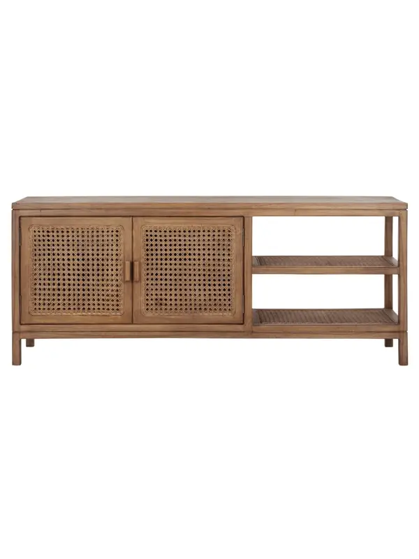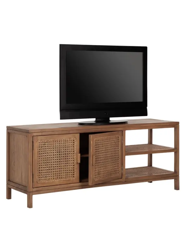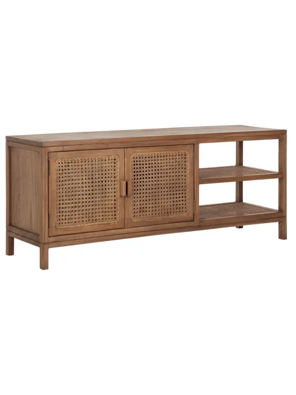 De meubels uit de Copenhagen serie zijn voorzien van handgeweven webbing. TV-meubel Copenhagen is gemaakt van massief mindi hout van A-kwaliteit en is afgewerkt met handgevlochten webbing, gevlochten door local craftsman. De deuren zijn voorzien van een d