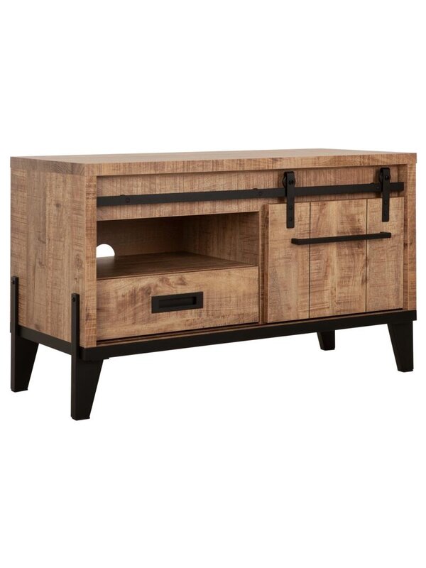 Tv-meubel Malaga is door het spannende contrast tussen de houtlook planken en het zwarte staal echt een statement in de woonkamer. De houtlook planken zijn gemaakt van hoogwaardig kunststof en bijna niet van echt te onderscheiden. Houtlook is gemakkelijk in onderhoud en bovendien kras- en slijtbestendig. De landelijke details en stoere pootjes maken dit tv-meubel helemaal af. Tv-meubel Malaga heeft een afmeting van 65x112x48 cm. Fan van dit design? Malaga is ook verkrijgbaar als bergkast, salontafels of dressoir.