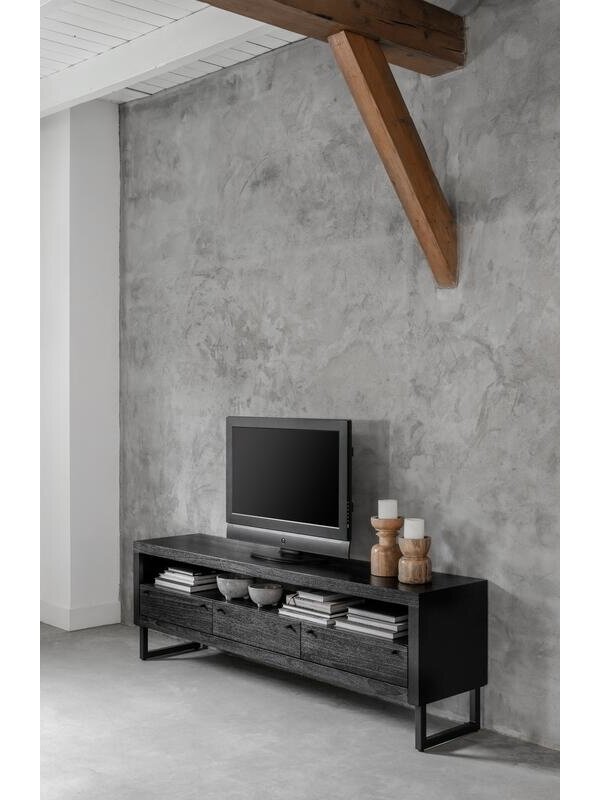 De prachtige Night is modern en super industrieel. Het tv-meubel is gemaakt van rustiek teakhout, dat zwart werd gelakt voor een stoere, strakke aanblik. In combinatie met het zwartstalen frame is hiermee een tijdloos ontwerp ontstaan. Dankzij het neutrale uiterlijk kan Night namelijk perfect gecombineerd worden met andere houtsoorten en kleuren. Tv-meubel Night heeft een afmeting van 57x180x40 cm.