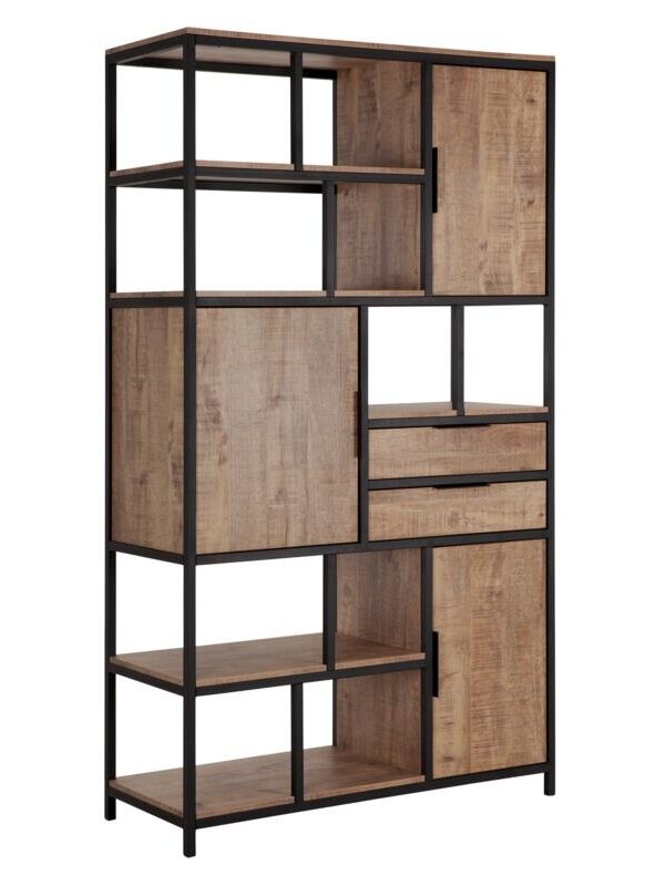 Met vakkenkast Valencia kom je nooit opbergruimte tekort. Met al die laadjes, plankjes en deurtjes heb je genoeg plek om je mooiste woonaccessoires, souvenirs en andere spulletjes tentoon te stellen. Valencia is door het spannende contrast tussen de houtlook planken en het zwarte staal echt een statement in de woonkamer. De houtlook planken zijn gemaakt van hoogwaardig kunststof en bijna niet van echt te onderscheiden. Houtlook is gemakkelijk in onderhoud en bovendien kras- en slijtbestendig. Vakkenkast Valencia heeft een afmeting van 212x120x48 cm.