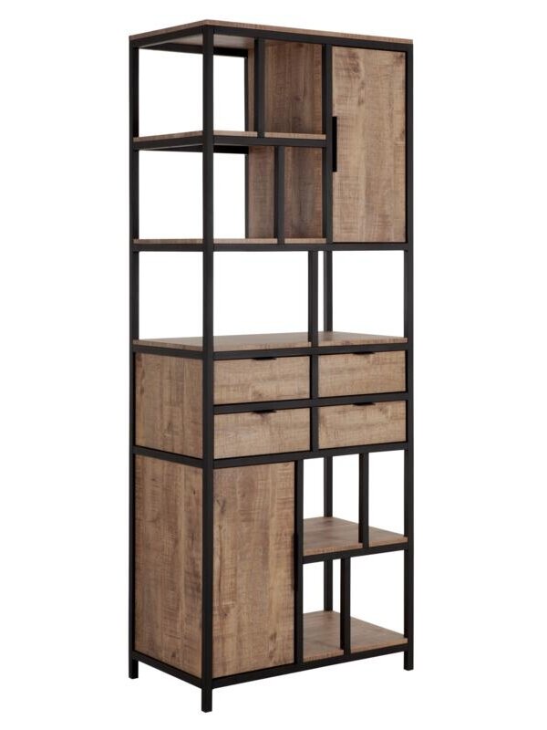 Met vakkenkast Valencia kom je nooit opbergruimte tekort. Met al die laadjes, plankjes en deurtjes heb je genoeg plek om je mooiste woonaccessoires, souvenirs en andere spulletjes tentoon te stellen. Valencia is door het spannende contrast tussen de houtlook planken en het zwarte staal echt een statement in de woonkamer. De houtlook planken zijn gemaakt van hoogwaardig kunststof en bijna niet van echt te onderscheiden. Houtlook is gemakkelijk in onderhoud en bovendien kras- en slijtbestendig. Vakkenkast Valencia heeft een afmeting van 212x80x48 cm.