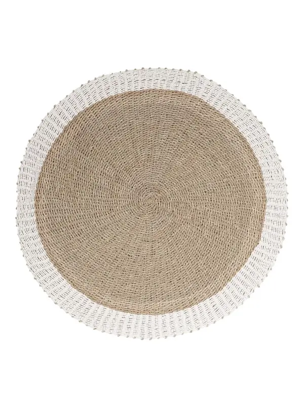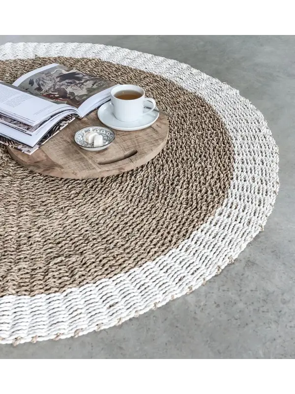 Met de ronde vorm van karpet Jamaica zorg je voor een speels effect in de ruimte. Zet er je favoriete fauteuil op, kleed het aan met veel groen en zo ontstaat er een fijne sfeer. Het natuurlijke en handgeweven karpet is gemaakt van zeegras, ook wel sisal genoemd. De combinatie van de kleuren wit en naturel geven het karpet een frisse uitstraling. Het karpet heeft een diameter van 120 cm en is ook buiten te gebruiken.