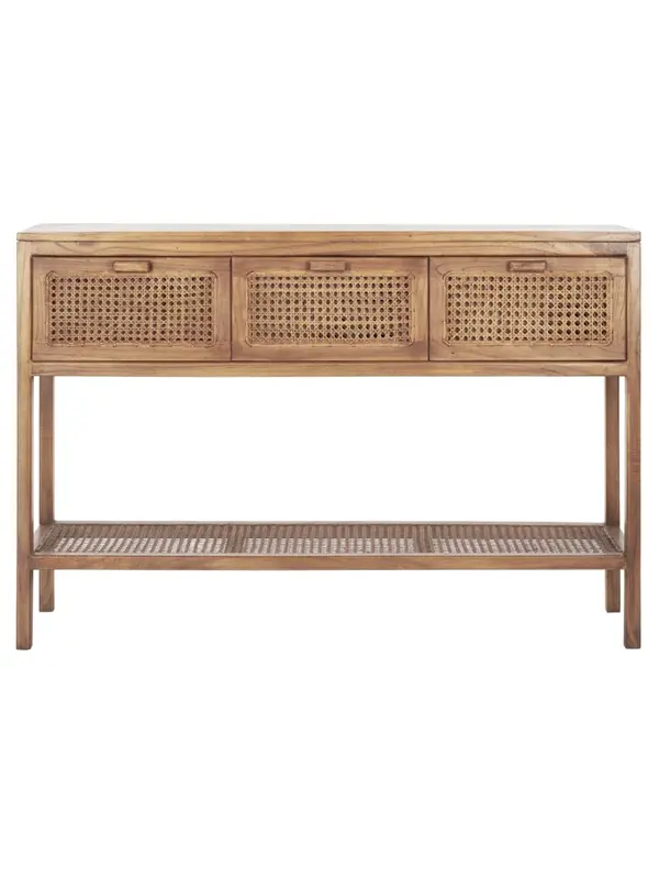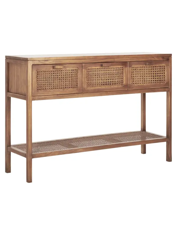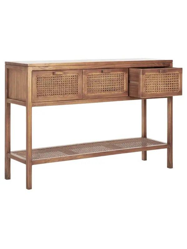Wandtafel Copenhagen is gemaakt van massief mindi hout van A-kwaliteit en is afgewerkt met handgevlochten webbing. Webbing is gemaakt van gevlochten rattan. De lades zijn voorzien van een dubbele laag webbing, waardoor de kast ook aan de binnenzijde perfe