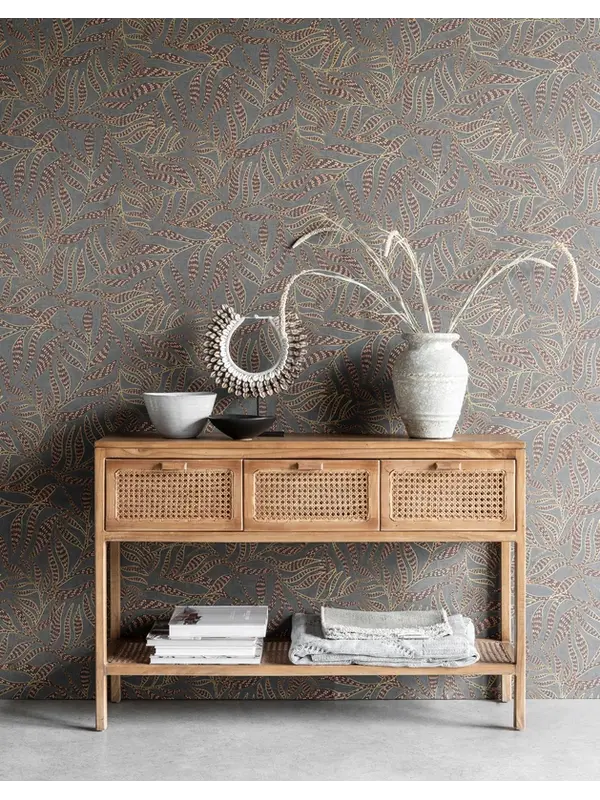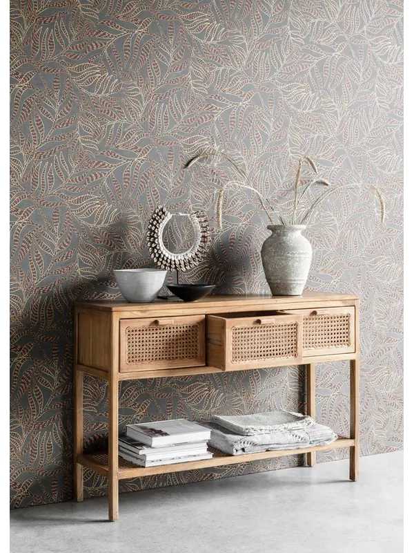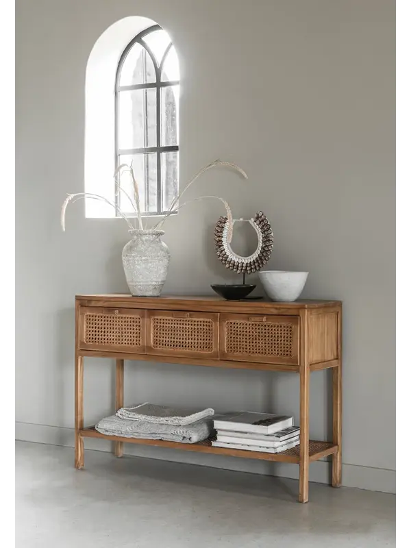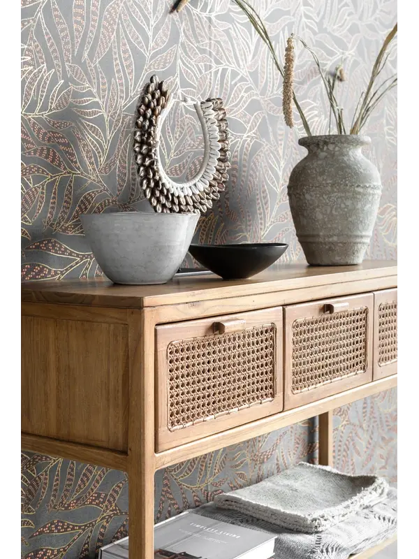 Wandtafel Copenhagen is gemaakt van massief mindi hout van A-kwaliteit en is afgewerkt met handgevlochten webbing. Webbing is gemaakt van gevlochten rattan. De lades zijn voorzien van een dubbele laag webbing, waardoor de kast ook aan de binnenzijde perfect is afgewerkt. Een mooi detail is het zichtbare webbing onderblad. Wandtafel Copenhagen is voorzien van 3 lades en heeft een afmeting van 80x120x35 cm.